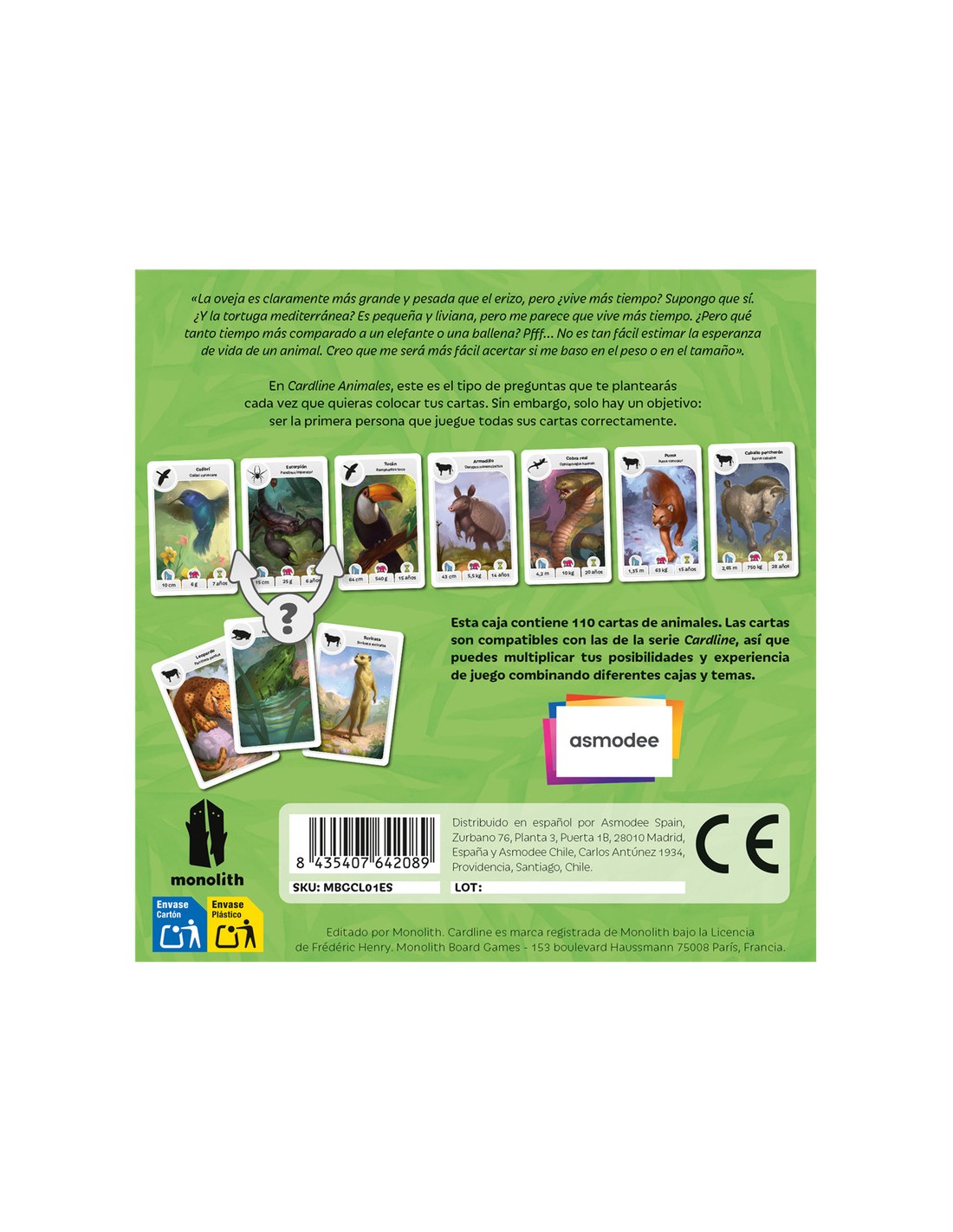 Cardline Animales es uno de esos juegos que enamoran a primera vista: rápido, educativo y sorprendentemente adictivo. Publicado por Asmodee, combina el encanto del reino animal con una mecánica sencilla que hace que cada partida sea distinta y llena de descubrimientos. Perfecto para familias, aulas y amantes de la naturaleza, funciona con 2 a 8 jugadores, a partir de 7 años, y ofrece partidas ágiles de unos 15 minutos.
