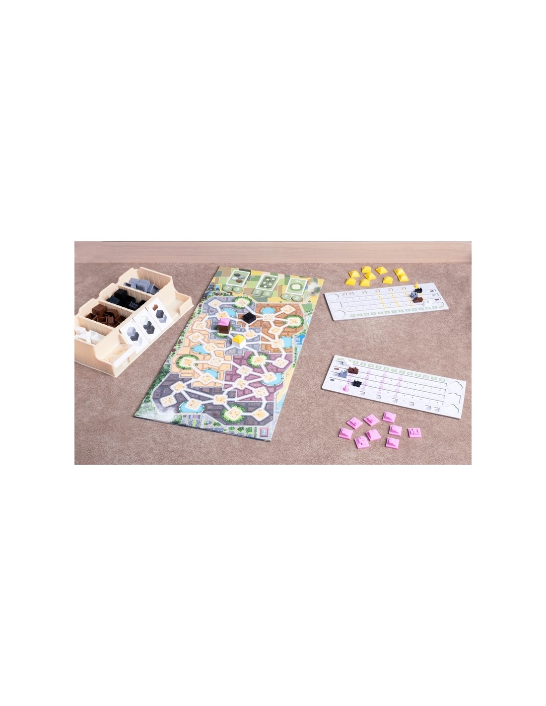 30 piezas de cada color (blanco, gris, negro, marrón) 10 tejados de cada color (amarillo, azul, naranja, rosa) 44 cartas de reserva 10 cartas de objetivo 12 fichas de bonificación 16 marcadores de máquina 4 marcadores de cono 4 tableros personales a doble cara 1 tablero dos caras dos bandejas reglamento