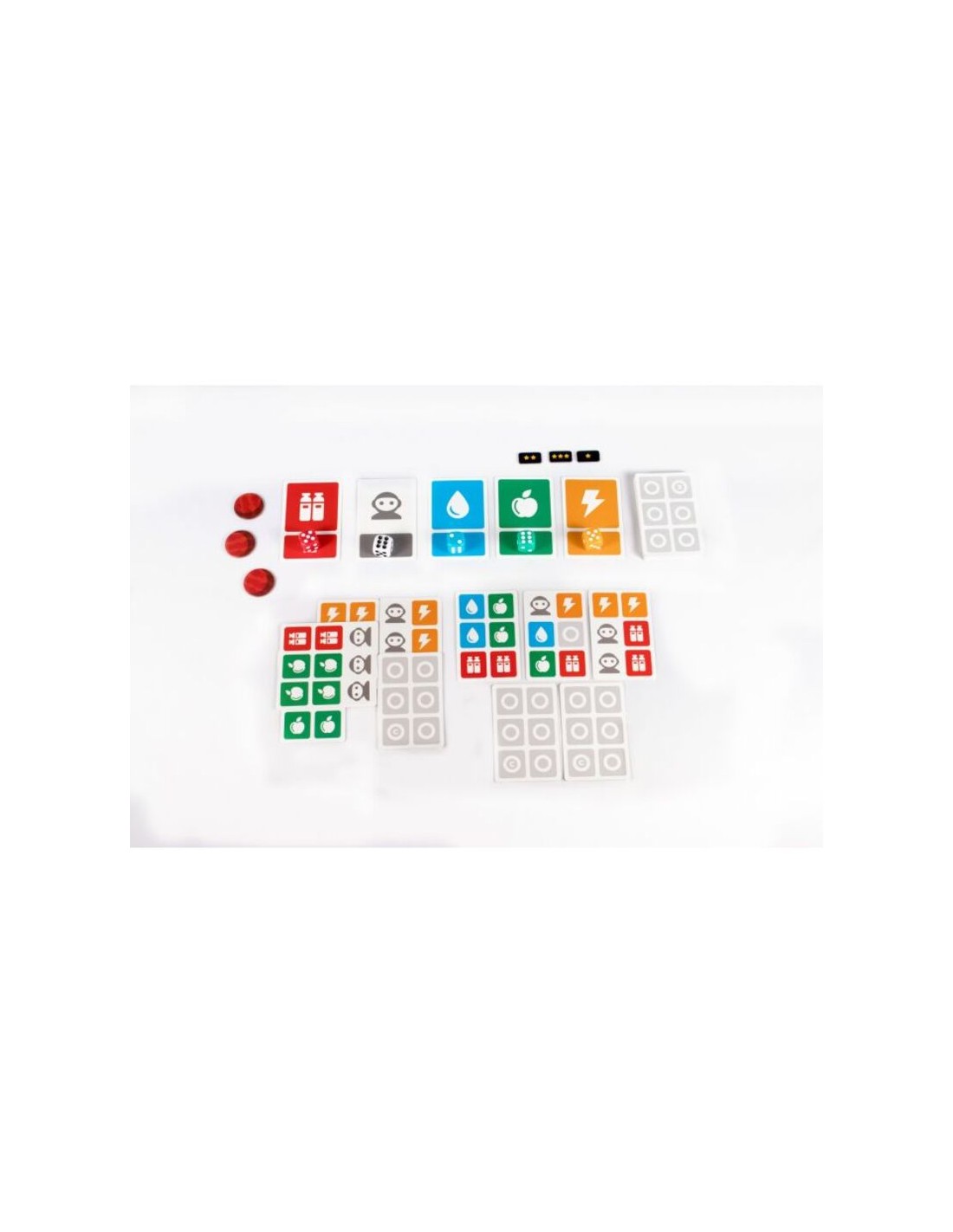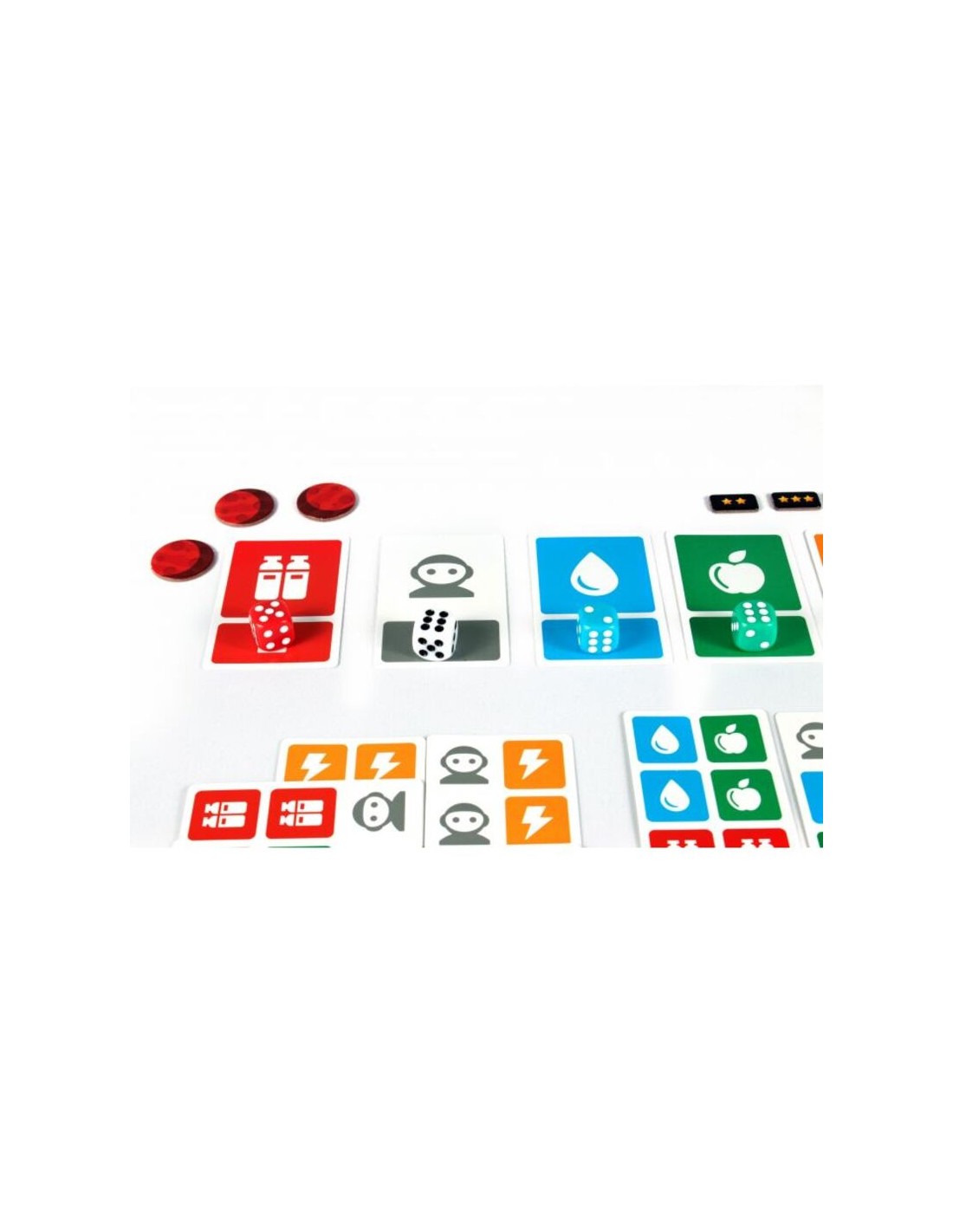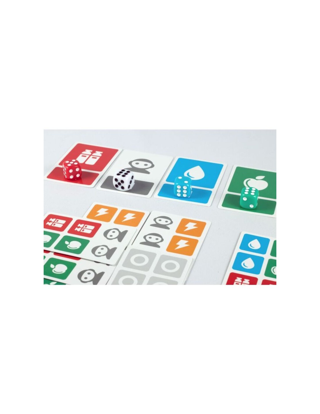 Lanzad los dados e intentad colocar las cartas de manera que se cumpla lo que se indica en cada uno de los dados de colores y finalizar la misión. ¿Cuántos astronatas deben quedar a la vista? Y, ¿agua?, ¿energía?.