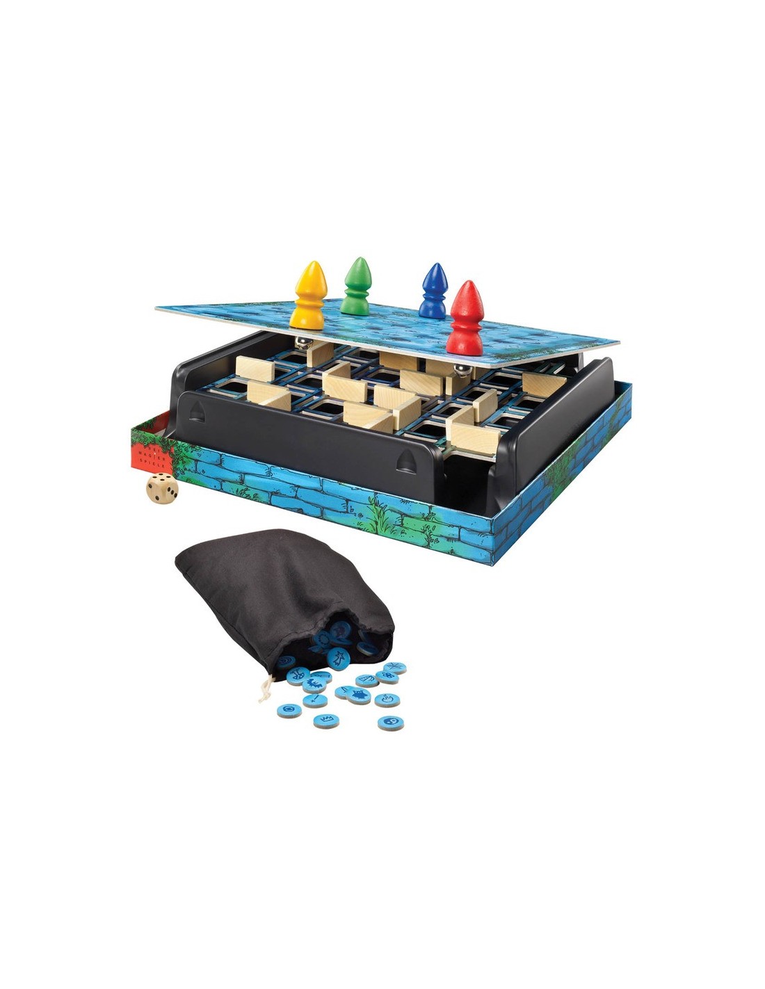 ¿Preparados para que empiece la magia? El laberinto mágico utiliza un sistema de doble tablero y el uso de imanes para simular los muros invisibles. Para empezar, deberéis crear el laberinto con las piezas de madera y el tablero inferior, en la misma caja. Según quién vaya a jugar, podéis ajustar la dificultad usando menos piezas, pero recordad: ¡todas y cada una de las casillas han de tener como mínimo una entrada! A continuación, tapad el laberinto subterráneo con el tablero principal, que muestra una cuadrícula de 6x6 con símbolos mágicos impresos. Tomad las fichas que muestran estos símbolos y ponedlos en la bolsa de tela; después de agitarla un poco, sacad una ficha y colocadla en el tablero. Por último, dad algunas vueltas al laberinto pronunciando un conjuro, tomad vuestros peones y situadlos en las esquinas del tablero. Cuando coloquéis los peones, tomad también una bolita metálica, que colocaréis bajo el suelo, justo debajo del peón, donde quedará suspendida en el aire por arte de magia. ¡Adelante aprendices!