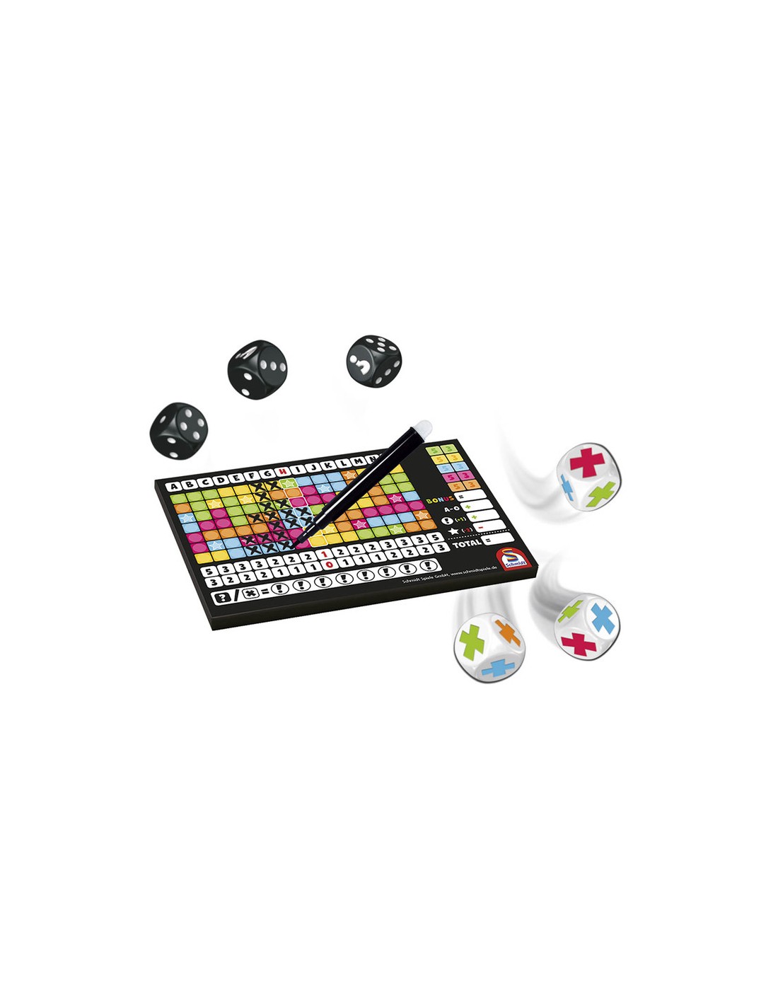 Hay bonus para los primeros jugadores que tachan todo un color (el primero en hacerlo se lleva más punto que el resto). La partida se acaba cuando un jugador logra tachar su segundo bonus de color. Entonces todos los jugadores paran y suman sus puntos. Cuentan en positivo todas las columnas tachadas y los bonus. Hay comodines que se puede gastar para escoger el color o número que quieras en una tirada de dados durante la partida, pero si te sobran al final de la partida también cuentan como puntos de victoria. Hay que tener cuidado, ya que hay alguna estrellas impresas en las fichas, y cada estrella no tachada son -2 puntos. Después de calcular la suma de los puntos de bonificaciones de color, los puntos de las columnas, los comodines y restar las estrellas no marcadas, tendrás el resultado total. El jugador con más puntos de victoria es el ganador.
