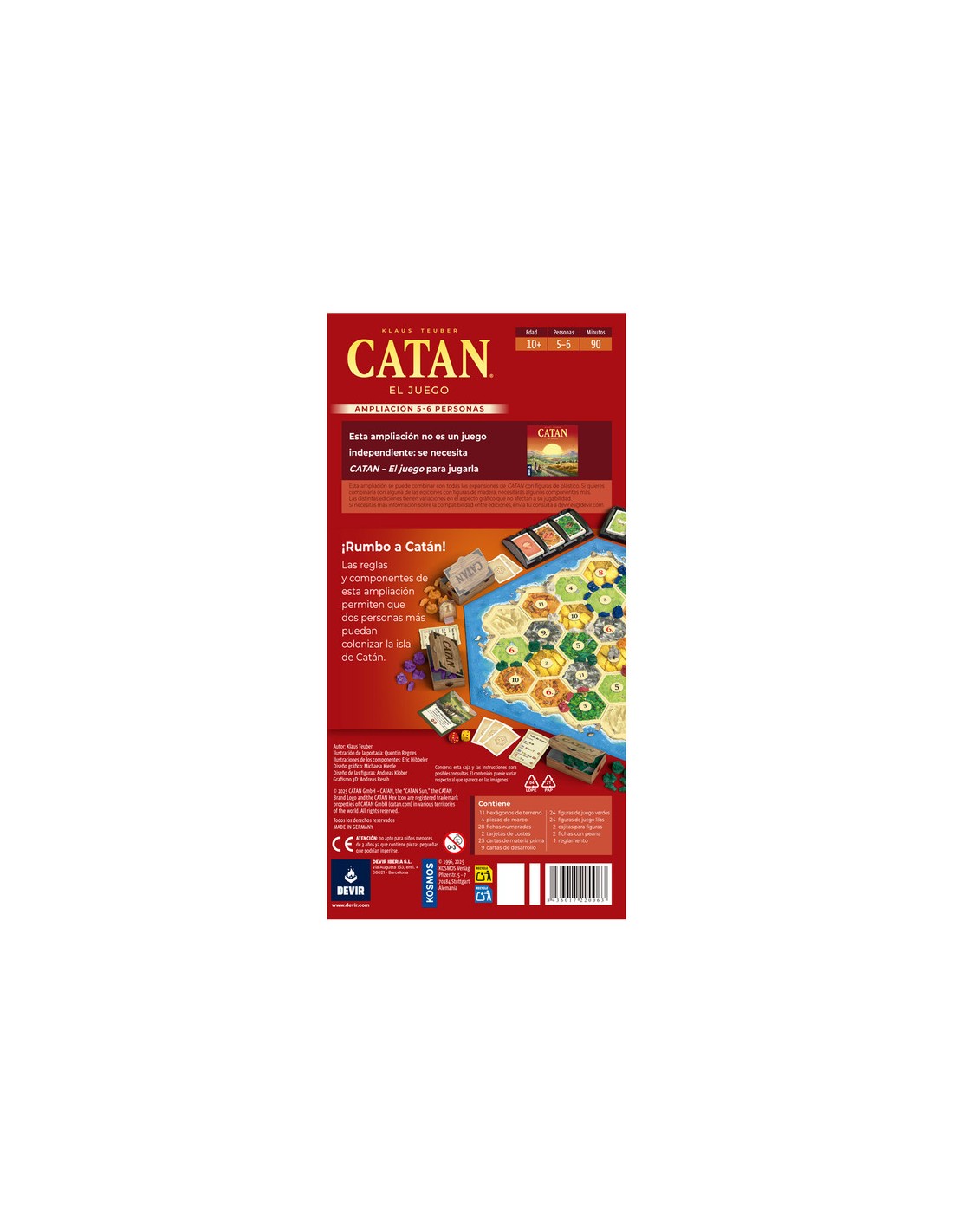 Añádelo a tu Catan Básico para jugar con toda la familia, la mejor manera de incluir a más jugadores en la experiencia de juego. Cuando añadas esta caja a tu estantería, podrás disfrutar de la experiencia Catan con hasta cinco amigos más. Este suplemento incluye todo lo necesario para que más gente pueda disfrutar de este juego de comercio, intercambio y estrategia. Se trata del producto que menos cuesta incorporar al juego básico de la línea, manteniendo el mismo nivel de complejidad y añadiendo componentes y cartas para poder compartir la partida con todos aquellos que se atrevan a aventurarse en la isla de Catan.