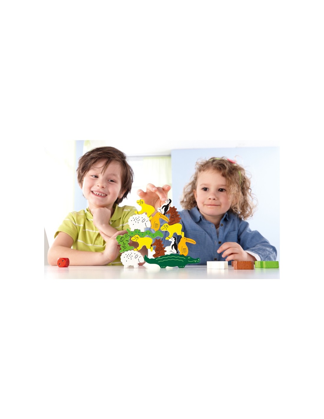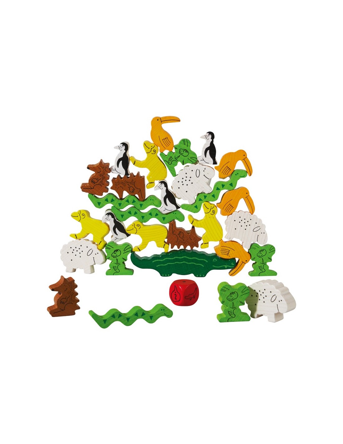 Animal sobre Animal es un juego de equilibrio con diferentes figuras de animales de madera. ¡Tira el dado, realiza la acción e intenta que no se derrumbe la pirámide de animales!