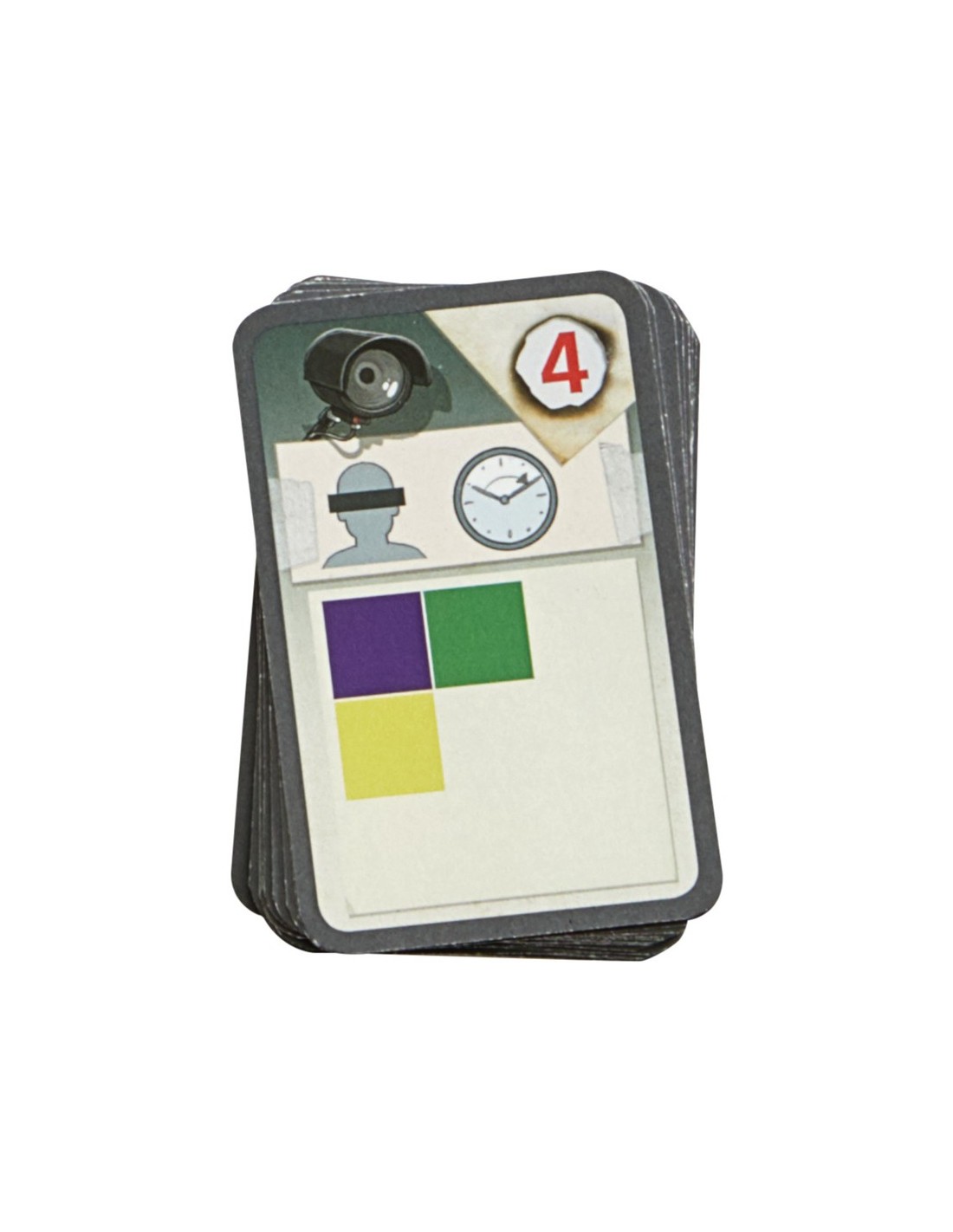 4 maletines-pantalla,4 rotuladores con borrador,4 expedientes de investigación,9 llaves de madera,1 tablero de soluciones,140 tarjetas: 72 con declaraciones de testigos y 68 de laboratorio (20 tarjetas con huellas, 24 tarjetas con hallazgos y 24 tarjetas con cámara de vigilancia),instrucciones del juego.