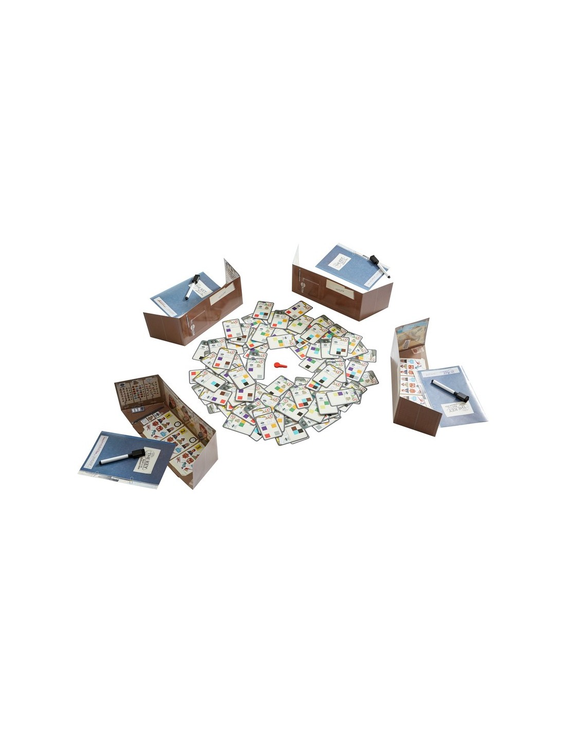 • Repartir un maletín-pantalla, un rotulador y un expediente de investigación por jugador. Se colocan las cartas en el centro de la mesa, mezcladas y boca abajo. Se elige una llave y se coloca junto a las cartas.