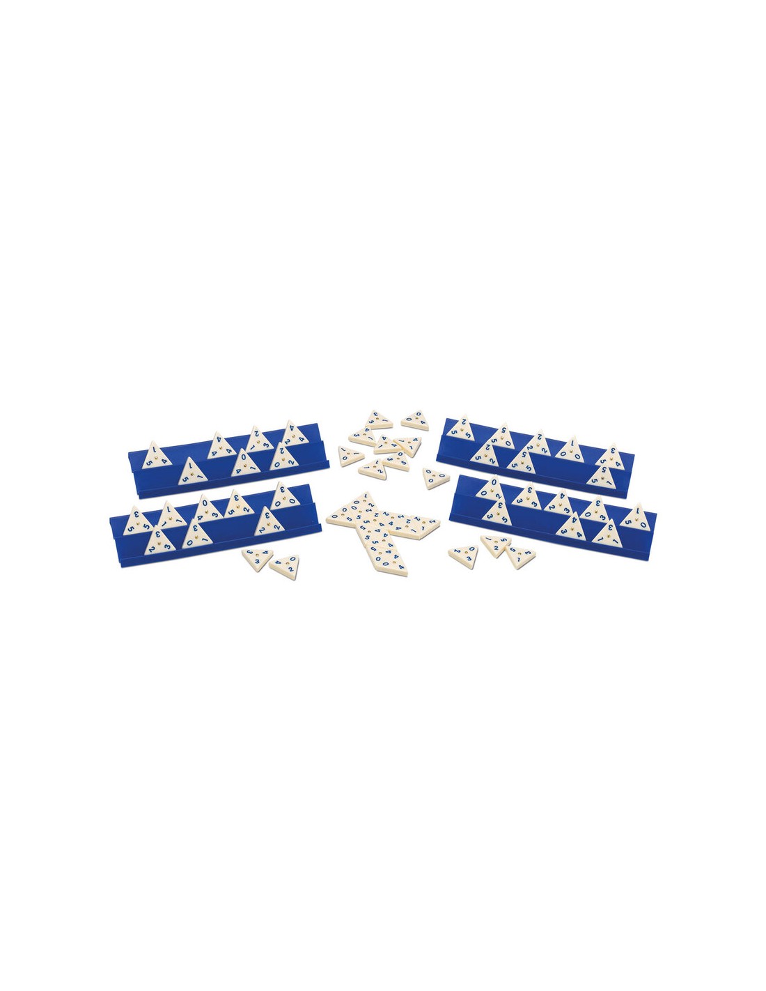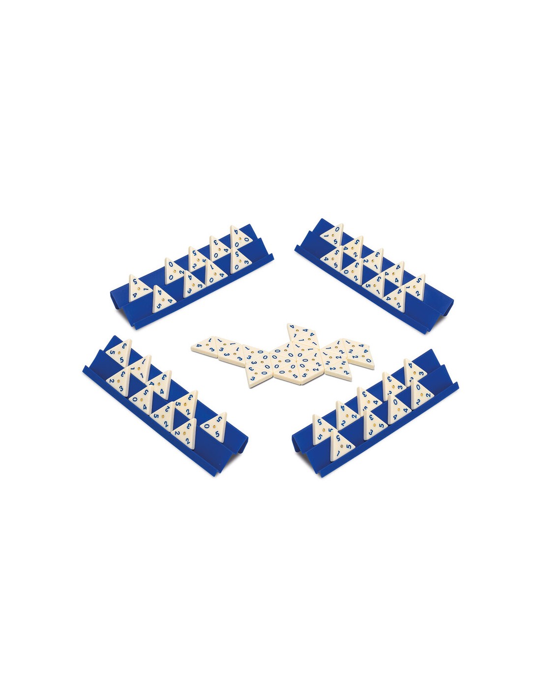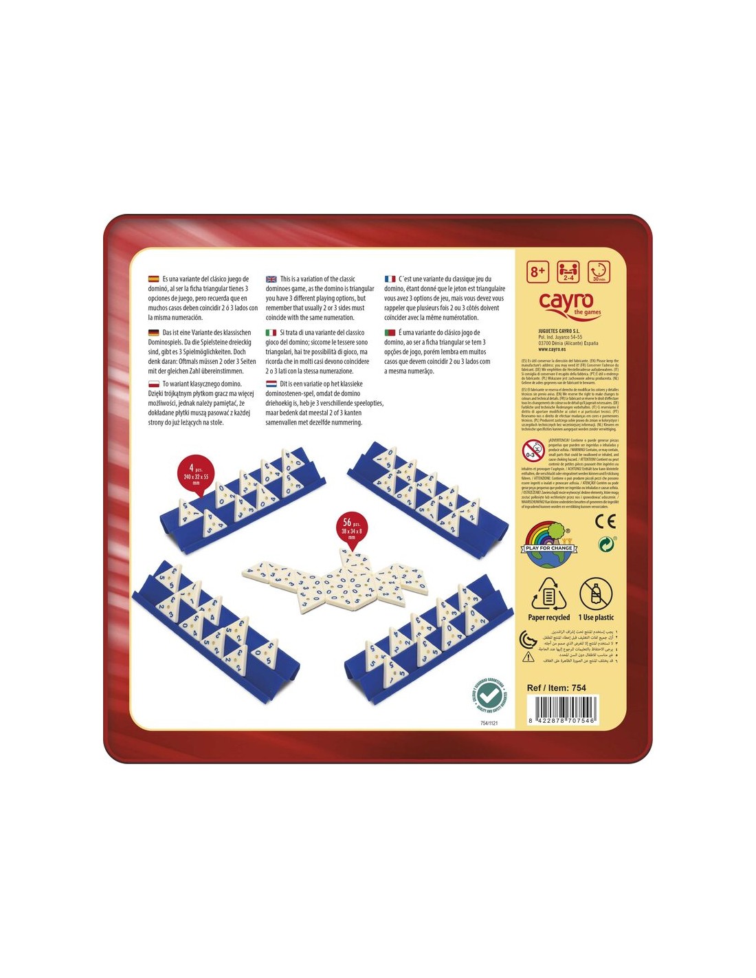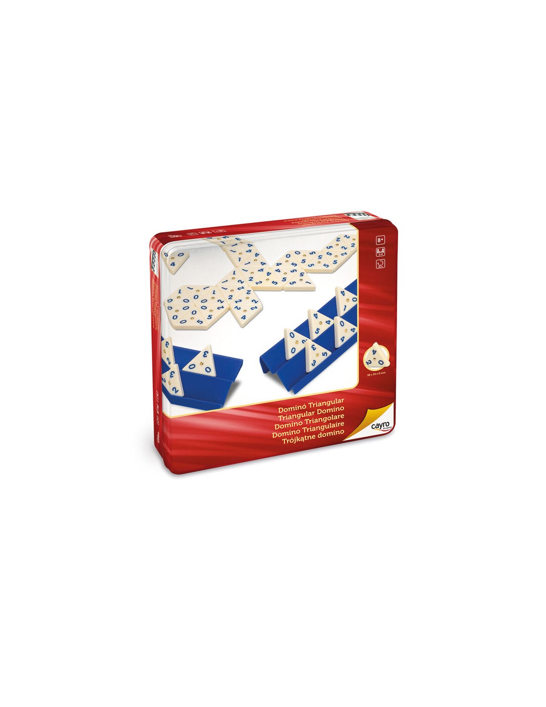 Dominó Triangular Metal Box es una variante del clásico juego dominó. En esta ocasión, al ser una ficha triangular tienes 3 opciones de juego pero hay que recordar que en muchas ocasiones las fichas van a tener que coincidir 2 ó 3 lados con otras fichas con la misma numeración.