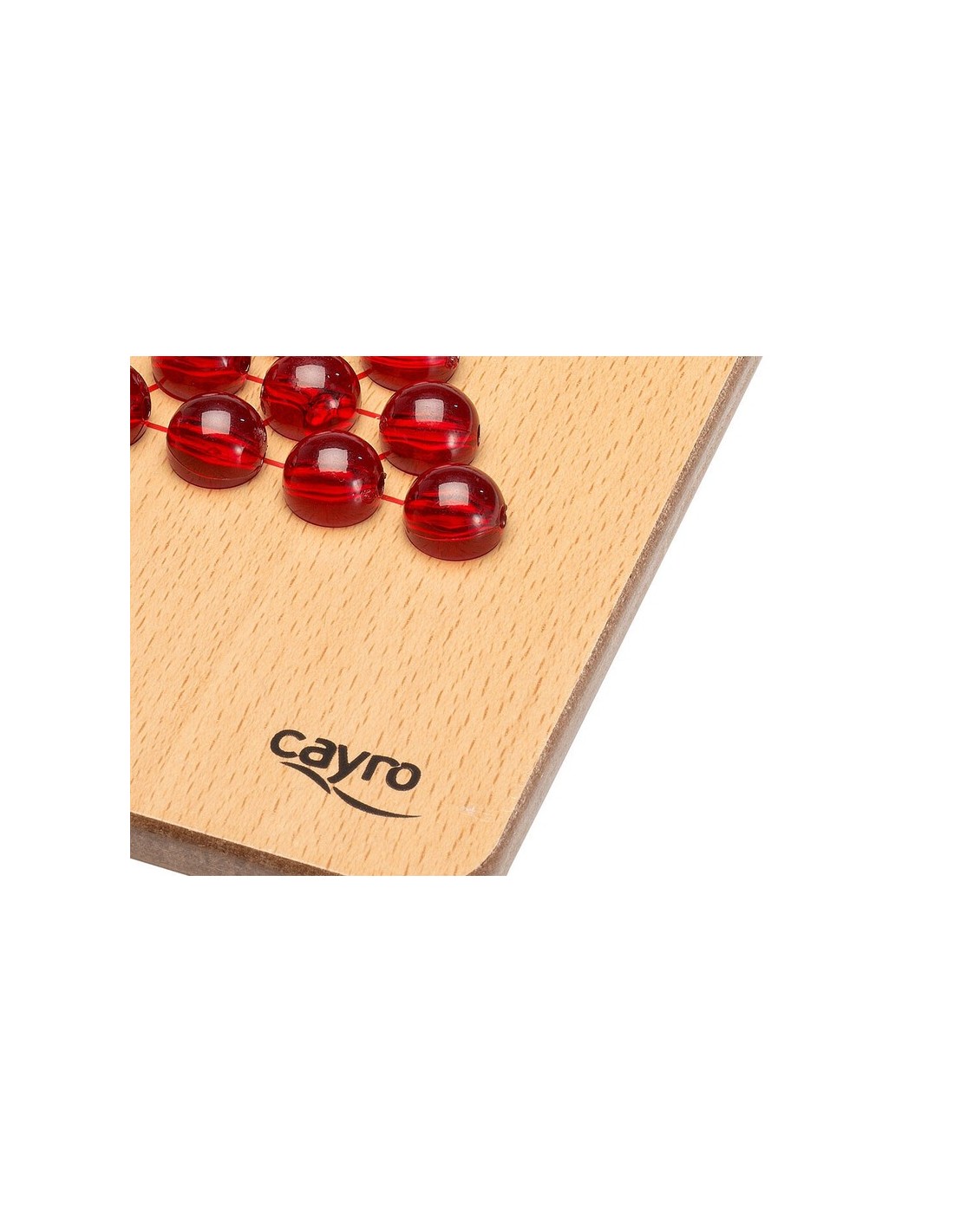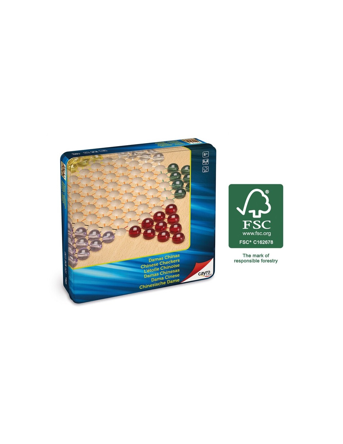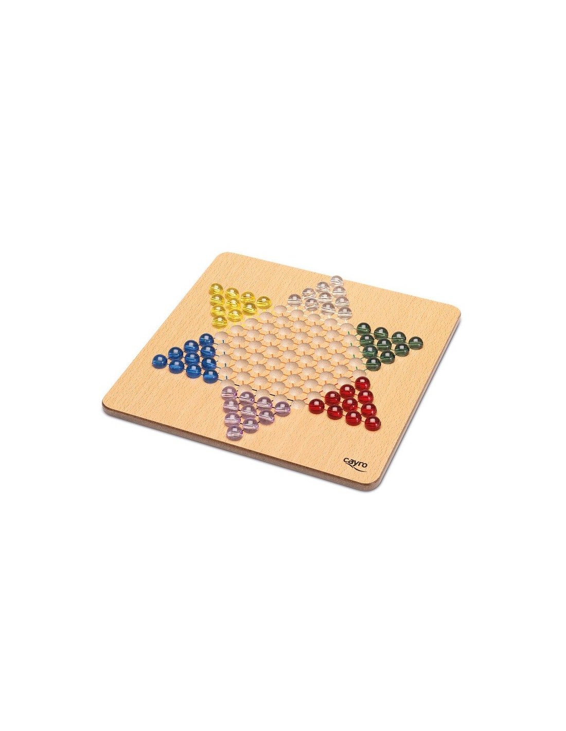 En esta versión de las damas chinas de Cayro, el tablero es de madera, las piezas son canicas de cristal, y la caja es metálica.