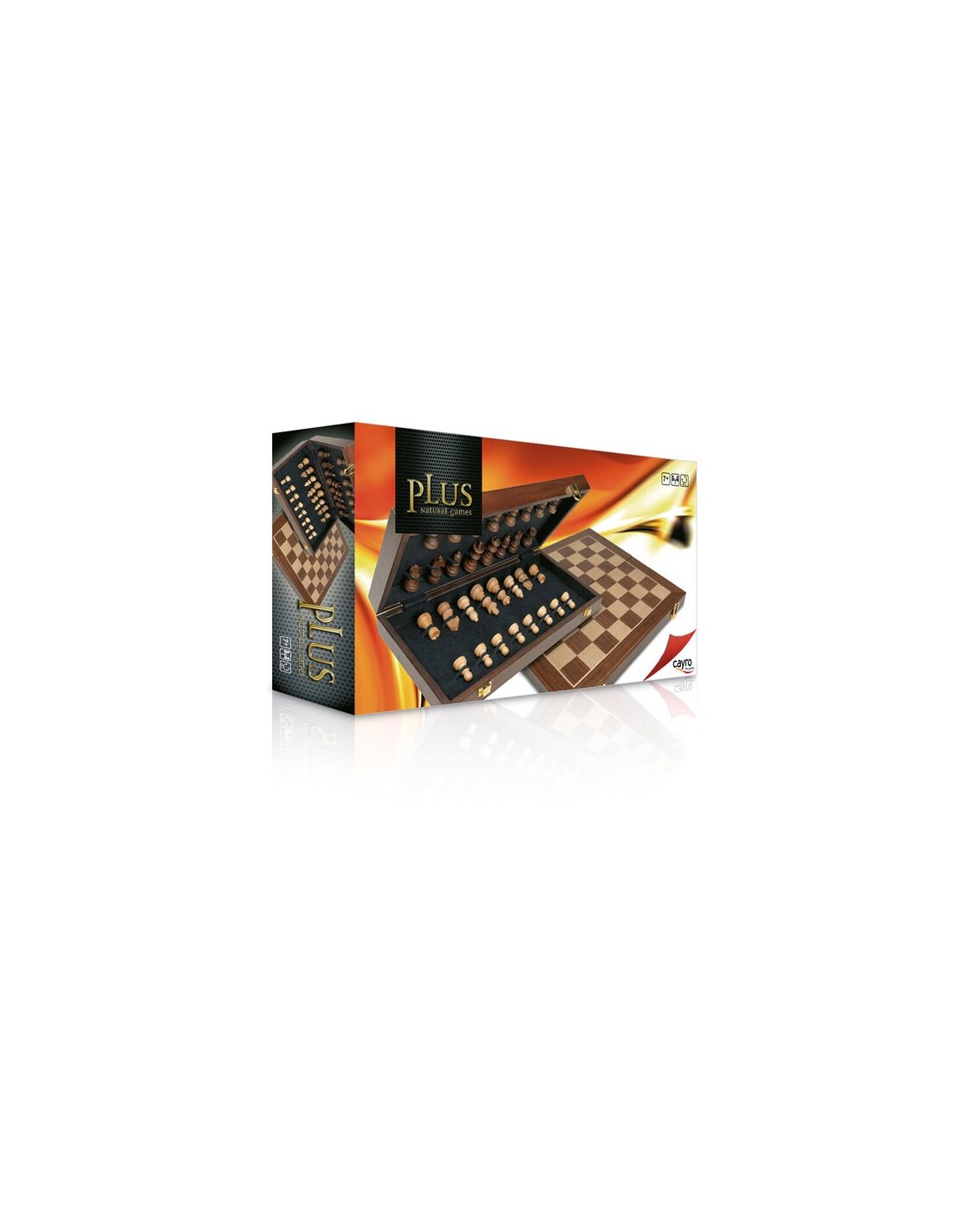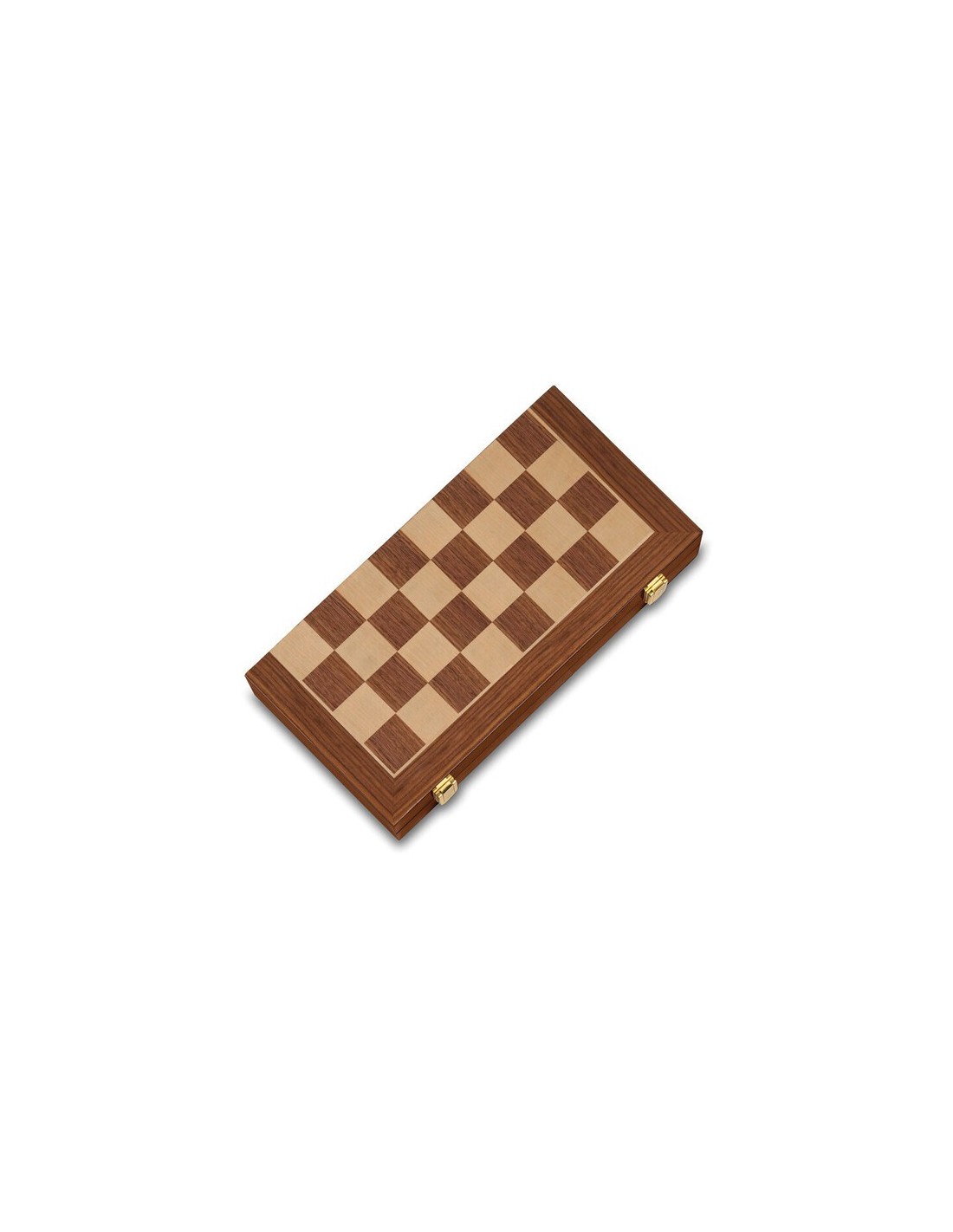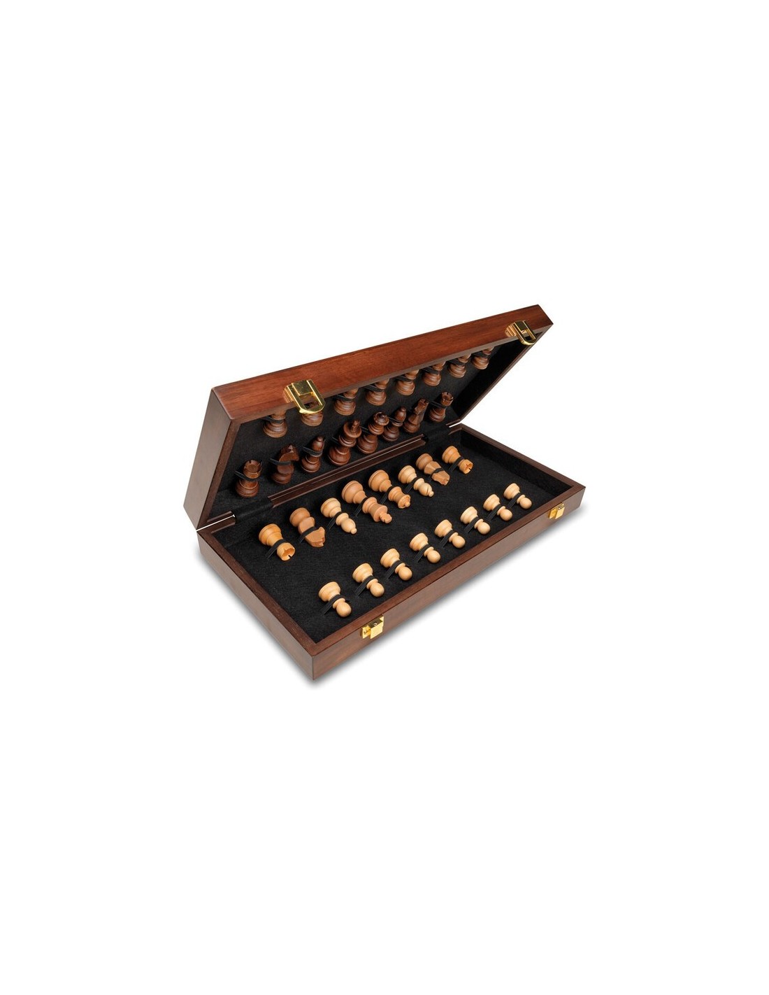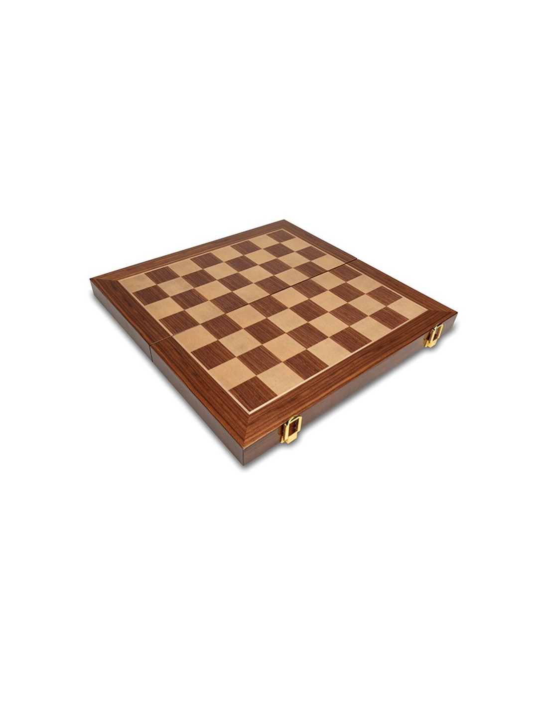 Estuche de madera plegable con tablero de ajedrez realizado en marquetería de 41x41 cm en la parte exterior barnizado brillo y en el interior forrada de fieltro con las figuras de madera sujetas sobre el fieltro para su transporte. Presentado en caja de cartón reciclable de diseño plus.