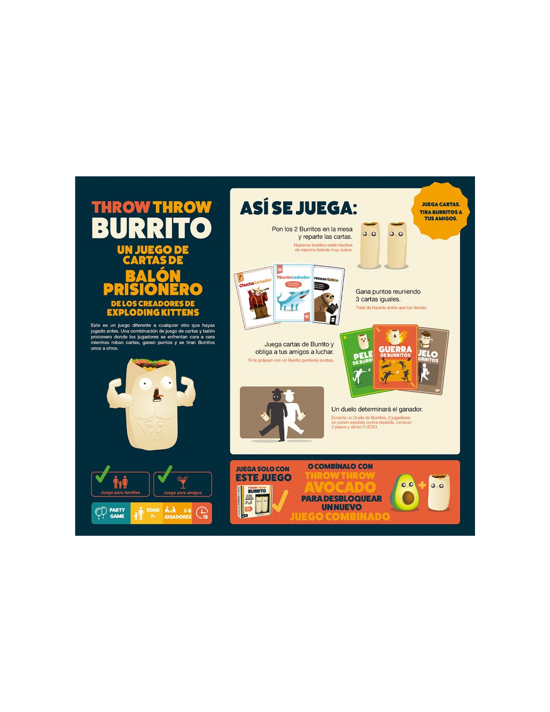 Throw Throw Burrito es un juego de mesa único que combina la estrategia de los juegos de cartas con la acción física del balón prisionero. Creado por los autores de Exploding Kittens, este título es perfecto para 2 a 6 jugadores, con partidas rápidas de 15 minutos llenas de risas, caos y burritos voladores.