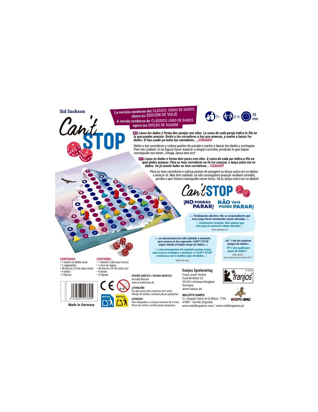 Can´t Stop es un juego de tentar la suerte de Sid Sackson publicado por primera vez en 1980. Cuenta con multitud de ediciones en todo el mundo. Lanza los dados, avanza tus corredores para llegar a la cima. Puedes arriesgarte o plantarte en cualquier momento, porque si con la tirada de dados no logras hacer avanzar a ningún corredor, perderás lo que hayas conseguido ese turno.
