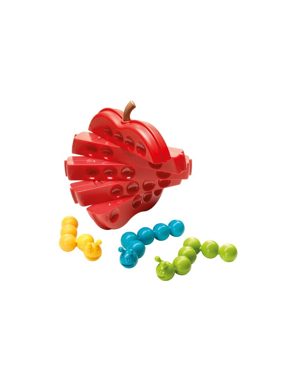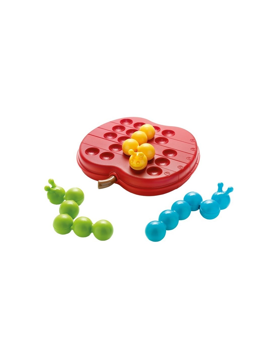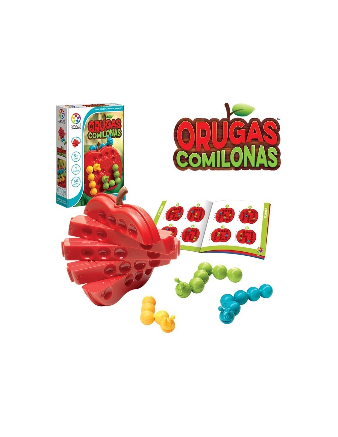 Tres orugas hambrientas quieren comer de la misma manzana. ¿Puedes doblarlas en la forma correcta?. ¡Este juego de lógica requiere un pensamiento flexible!. No solo las orugas son ajustables, ¡el tablero de juego con forma de manzana se puede girar!. Con 60 desafíos de fácil a experto, Orugas Comilonas ofrece mucho que comer ¡y qué pensar!.
