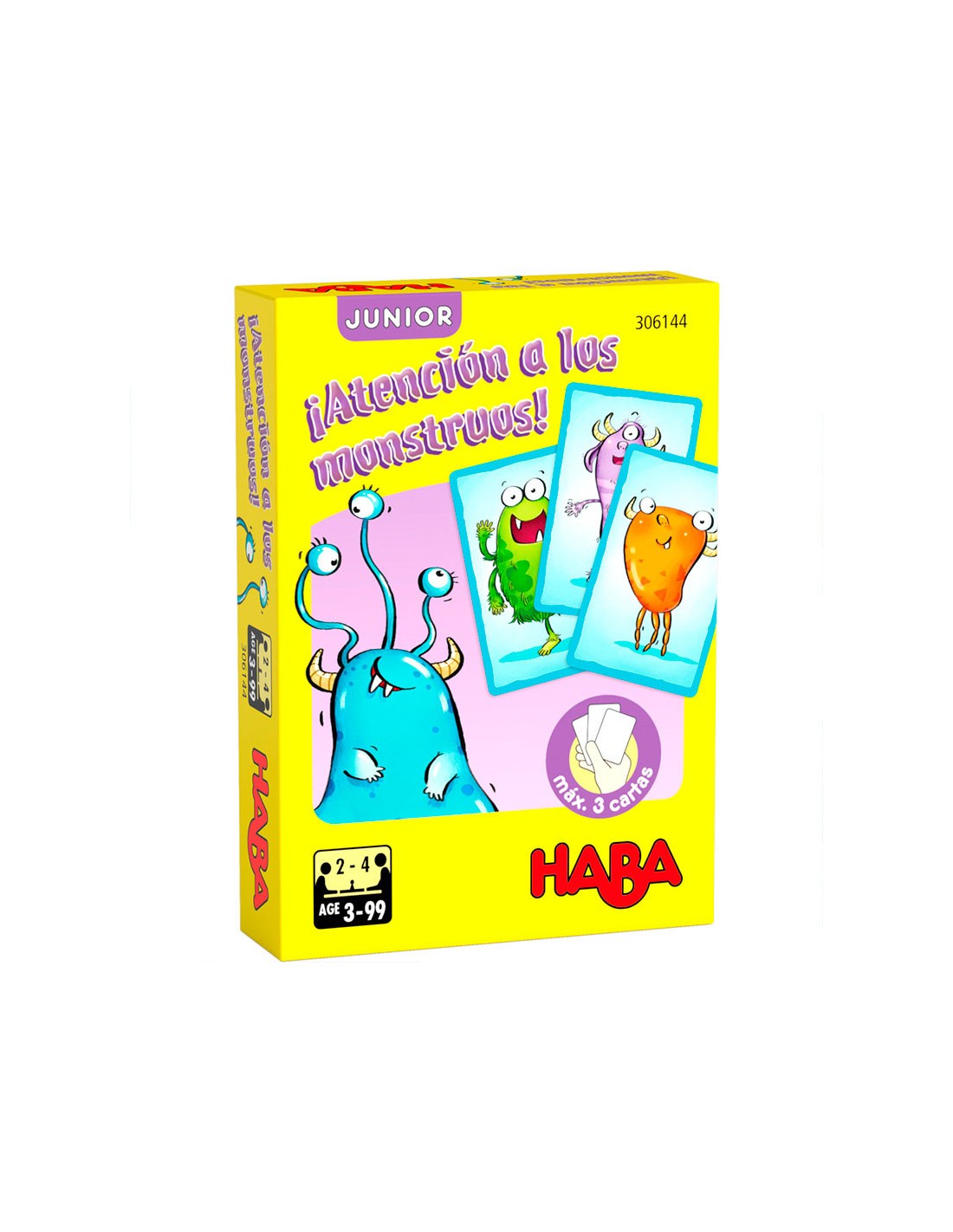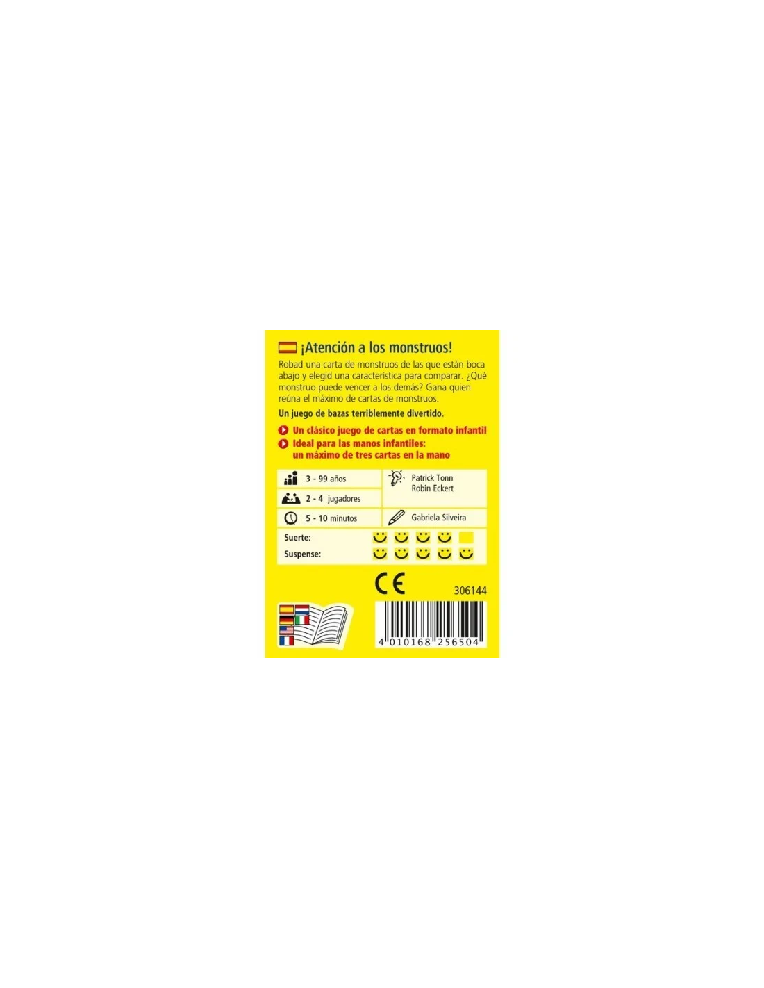 Atención a los Monstruos Jr. es un sencillo juego de bazas para los más pequeños. Los jugadores roban una carta de monstruos de las que están boca abaja y elegirá ojos, manos o patas con el fin de vencer a las cartas del resto de jugadores en la característica elegida. Ideal para las pequeñas manos y para llevar de viaje a cualquier sitio.