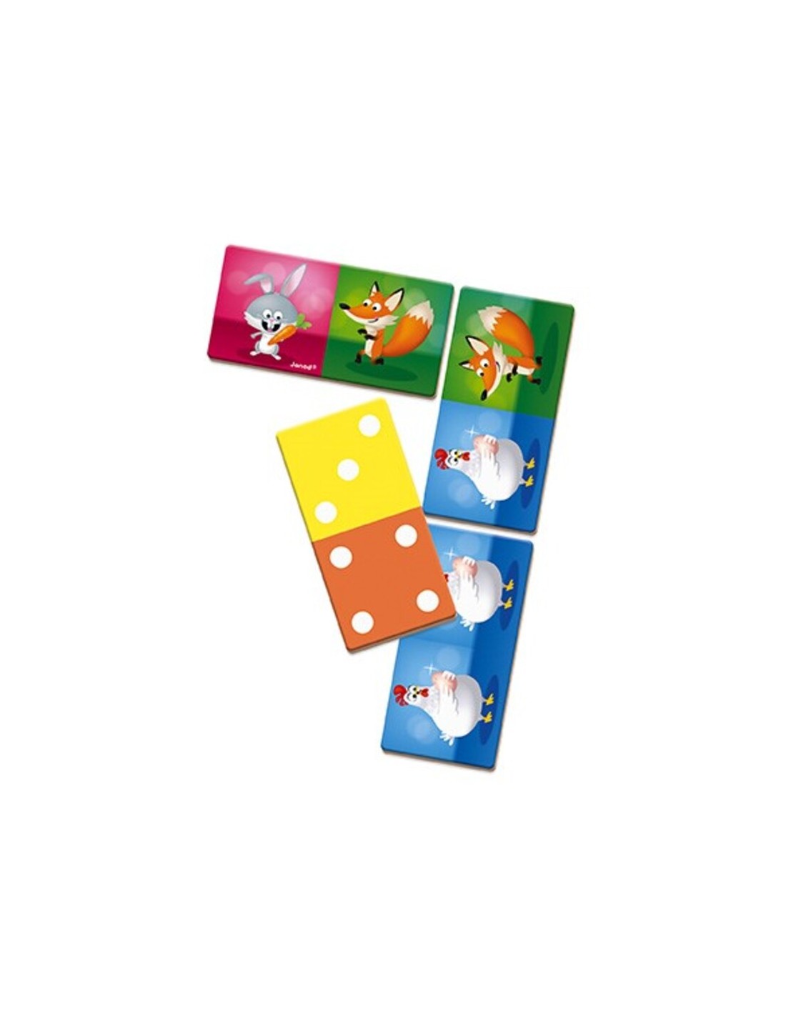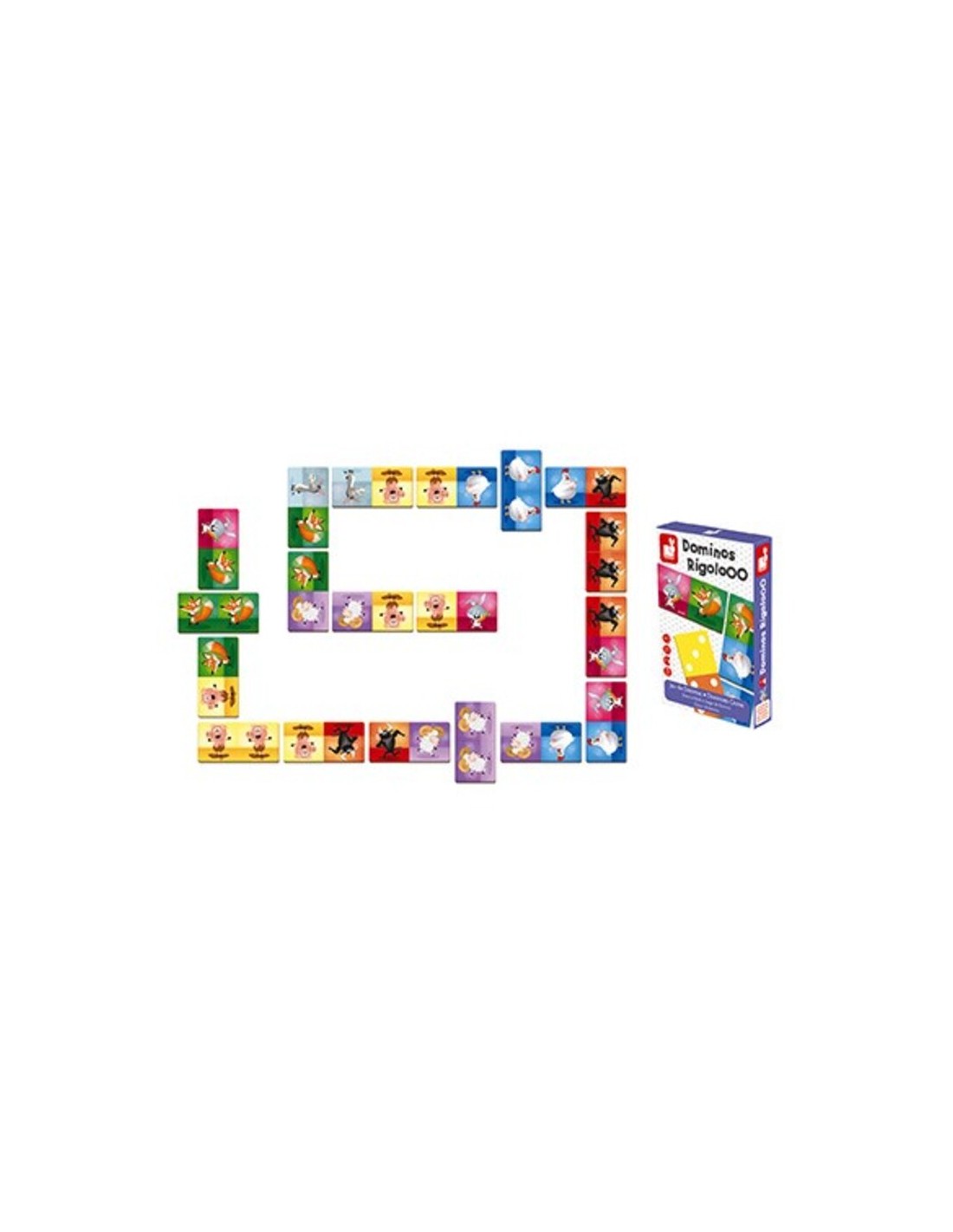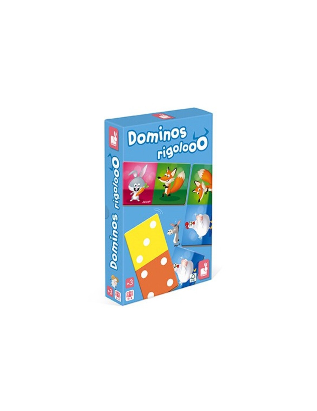 Dominó Rigolooo de Janod contiene 28 piezas de domino de cartón. 2 posibilidades de juego: un lado ilustrado, para localizar y montar las 2 animales idénticos, un lado numerado, ¡para que los pequeños aprendan y pequeños y grandes se diviertan! De 2 a 4 jugadores.
