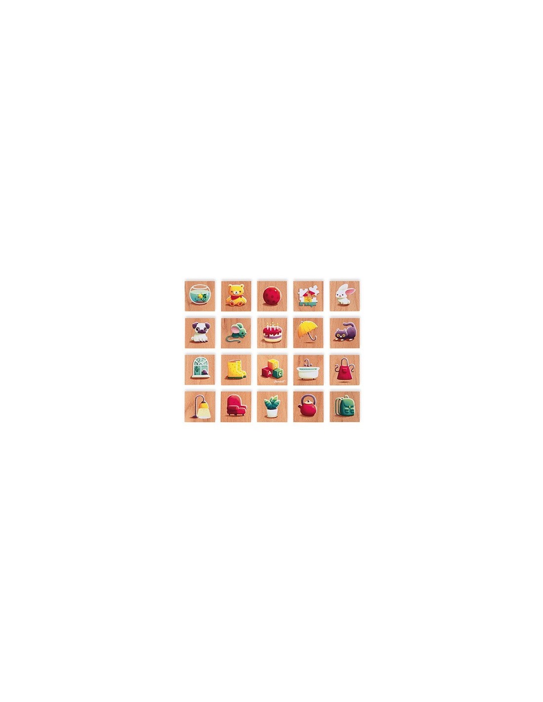 Precioso juego de memoria de la marca JANOD con la temática de las primeras palabras compuesto por 40 piezas de madera de haya. Ideal para que su hijo se familiarice con las primeras palabras, este juego de memoria con imágenes ha sido concebido para estimularle y animarle en sus progresos.