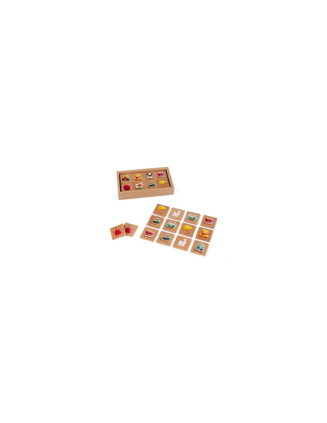 Juego de memoria con la temática de las primeras palabras compuesto por 40 piezas de madera (de haya). Ideal para que su hijo se familiarice con las primeras palabras, este juego de memoria con imágenes ha sido concebido para estimularle y animarle en sus progresos.
