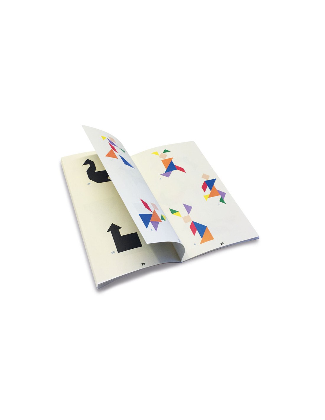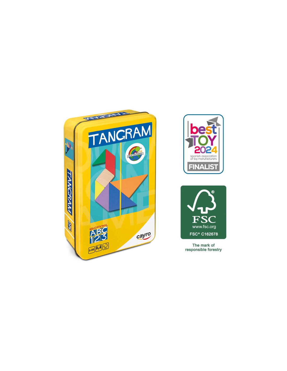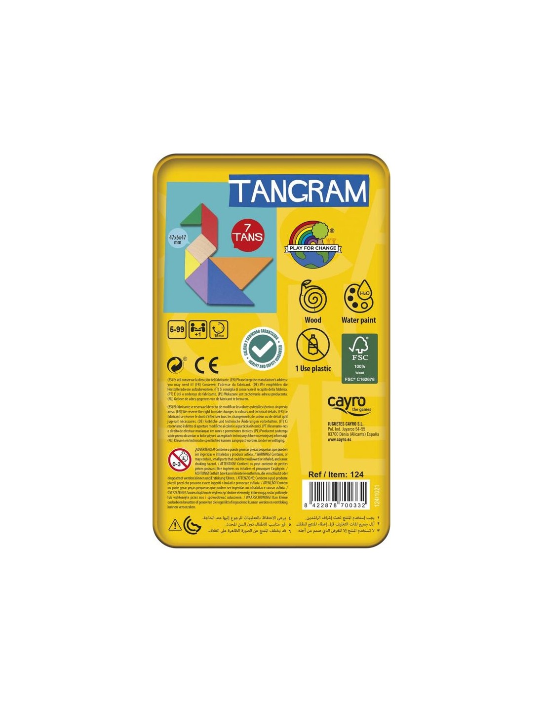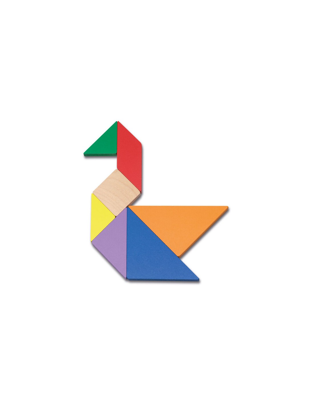 7 piezas de madera (5 triángulos, 1 cuadrado y 1 paralelogramo) con colores vivos y certificado FSC.