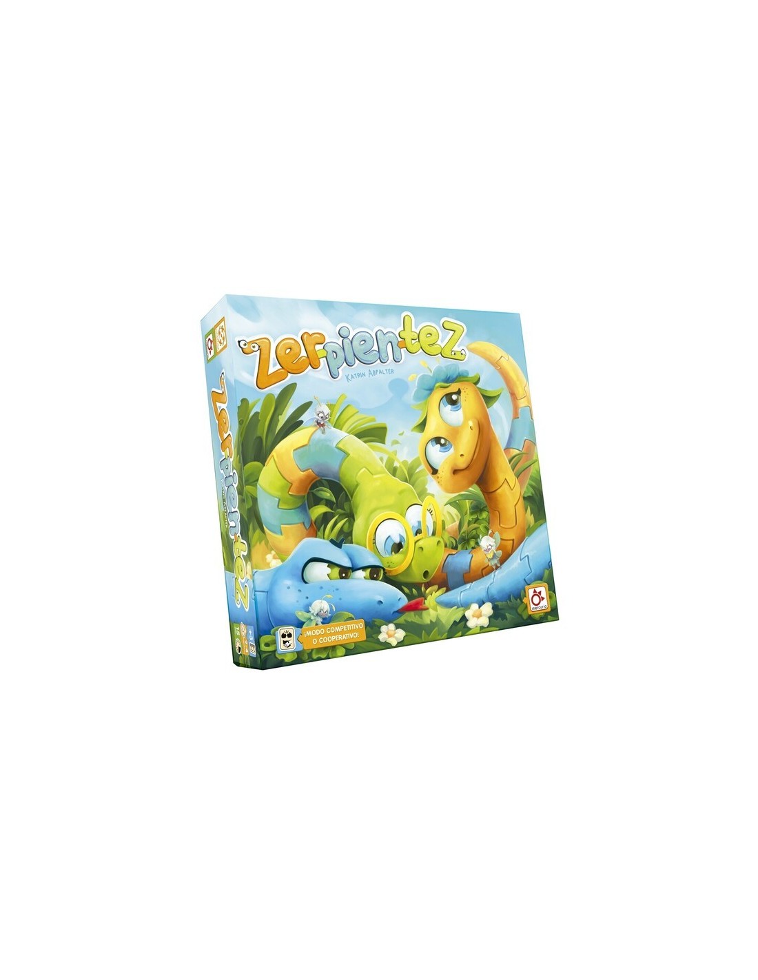 Zerpientez: Estas divertidas serpientes juegan a enroscarse y ver cuál puede acercar más su cola a su cabeza. iHaz que la tuya sea la ganadora! lanza el dado y añade nuevas partes a tu serpiente. Tiene también dos modos de juego cooperativo. Contiene además multitud de pegatinas para que decores las serpientes como más te gusten.