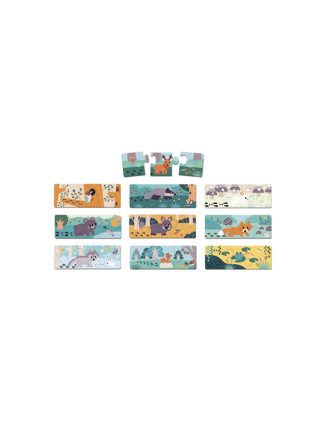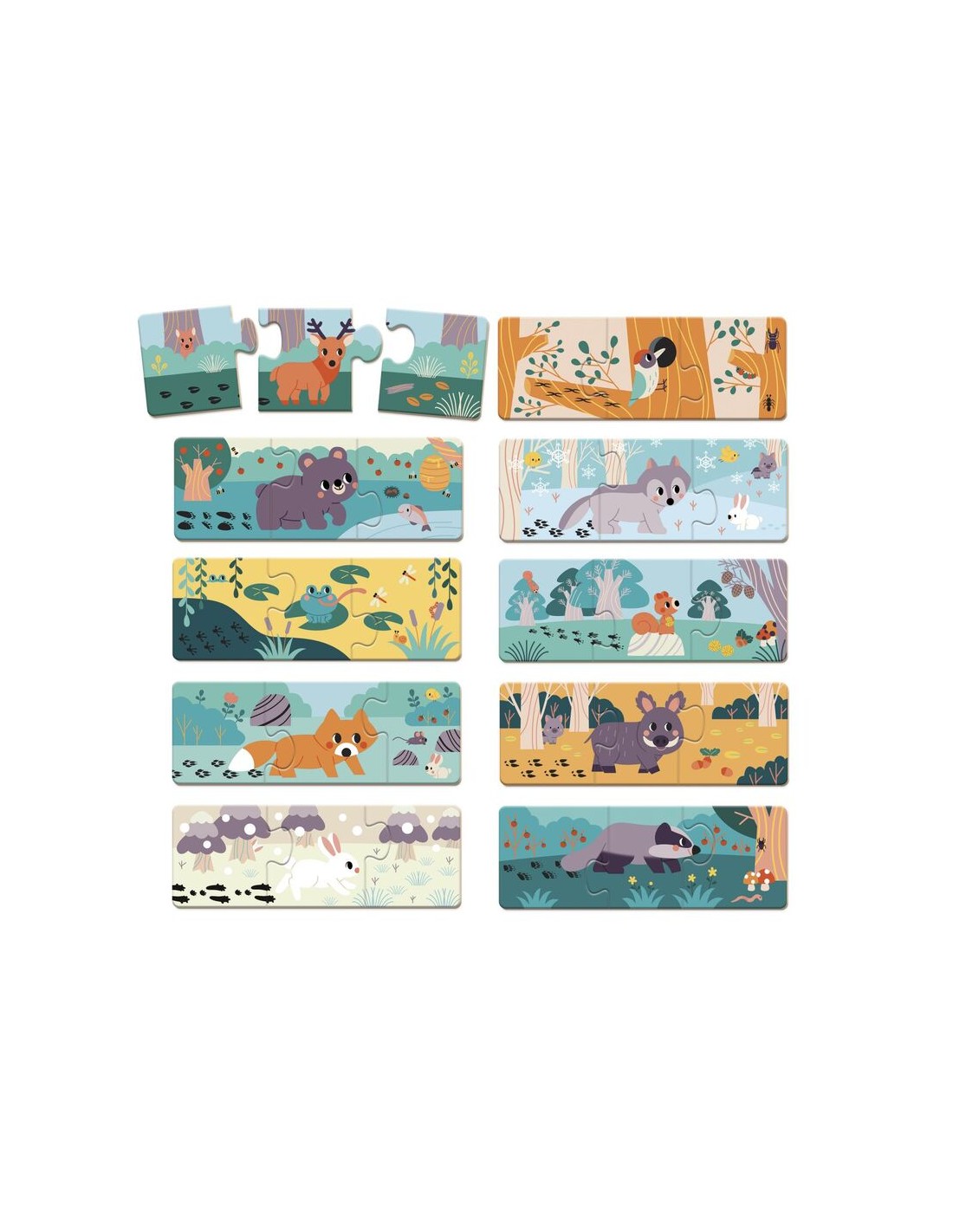 Puzzle Animales las Huellas consta de 10 puzzles de 3 piezas para que los niños a partir de 2 años puedan asociar los distintos animales del bosque con las huellas que dejan. Diseñado en colaboración con WWF® y fabricado con cartón con certificado medioambiental FSC® con la compra de este puzzle se colabora con la preservación del medioambiente y la biodiversidad.