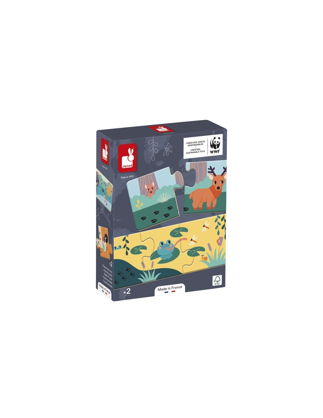 ¡Aprender a identificar a los animales y sus huellas con un puzle para los más pequeños es una gran idea! Este puzle educativo para niños a partir de 2 años es un juego de asociación y también de lógica que llevará a los más pequeños al bosque tras la pista de los animales que dejan sus huellas allí por donde pasan. Este estuche incluye 10 puzles de 3 piezas para que los monten con sus manitas. Las bonitas y coloridas ilustraciones servirán al niño para identificar las huellas del animal en la primera pieza, al animal en la segunda y, por último, lo que come en la última. El tamaño de las piezas es ideal para sus pequeñas manos. Este juguete educativo de cartón cuenta con el certificado FSC® mix y se fabrica en Francia. Se ha diseñado en colaboración con WWF®. Janod apoya los esfuerzos de WWF® para preservar el medio ambiente y la biodiversidad con una nueva gama de juguetes fabricados con materiales más sostenibles. A través de esta colección, queremos inspirar y concienciar a las generaciones más jóvenes a favor de la fauna y la naturaleza.