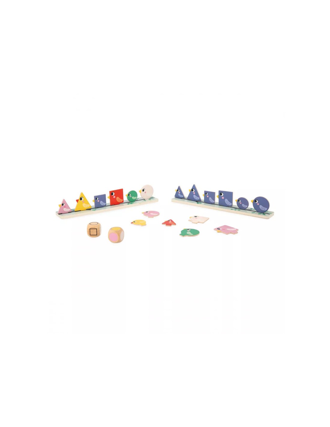 Este juego de clasificación consta de 72 pájaros de madera: cuadrados o redondos, grandes, pequeños, verdes o azules… están todos mezclados, así que hay que ayudarles a encontrar a sus familias. Con los dados, los niños sabrán qué color, forma y tamaño deben buscar. De forma totalmente autónoma podrán cruzar esos datos y posar en la rama los pájaros en cuestión. ¡Es muy práctico porque, gracias a las dos ramas, pueden jugar dos niños a la vez e incluso retarse!