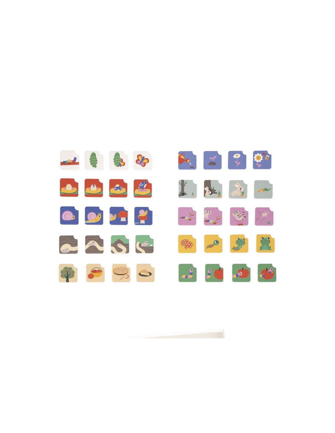 ¿Cómo se forma una mariposa? ¿Cómo se convierte una semilla en una flor? Acompañe a su hijo a descubrir la naturaleza con las tarjetas de secuencias. El objetivo del juego es encontrar la cronología de cada acción. En el juego, se ofrecen 10 acciones de 4 etapas, es decir, 40 tarjetas, así como un tablero de madera.