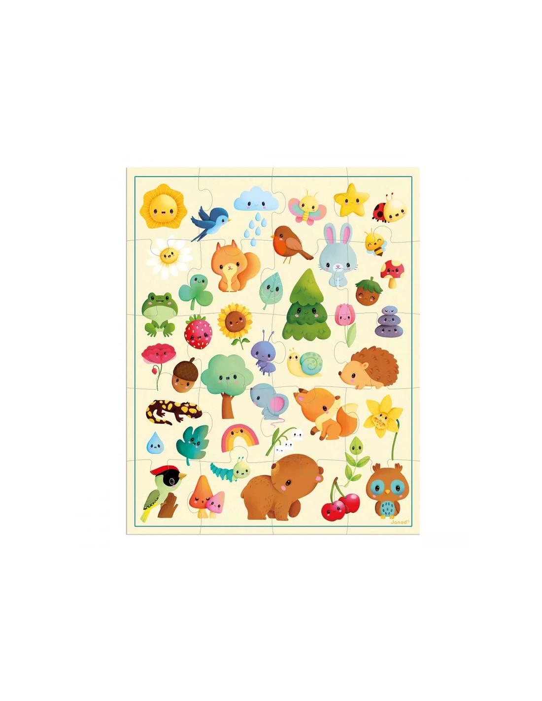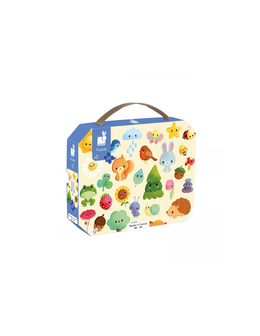 Puzzle de imágenes de la naturaleza de Janod, es un puzzle de 20 piezas y un gran tamaño, recomendado a partir de 2 años. Primero con ayuda y después sólos, niños y niñas podrán construir un precioso puzzle con multitud de animales y plantas. Una vez construido podrán jugar a decir los nombres: salamandra, rana, fresa, amapola....