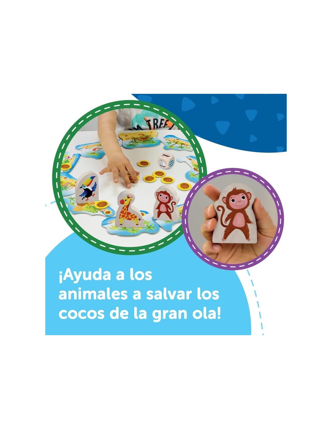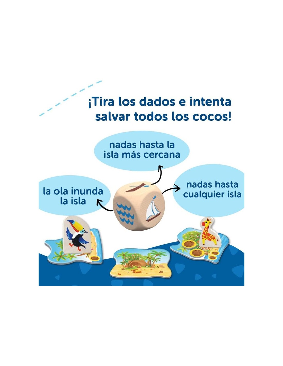 Tira los grandes dados de madera para viajar por las islas y salvar la fruta. ¿Conseguirá trasladar todos los cocos a tierra firme antes de que se inunden las islas?