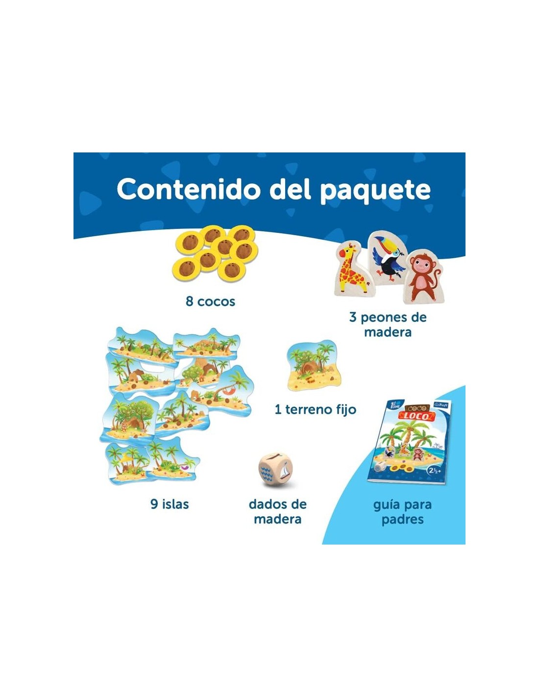 9 islas, la tierra firme, 8 cocos, 3 peones de madera, un gran dado de madera y una guía para los padres.