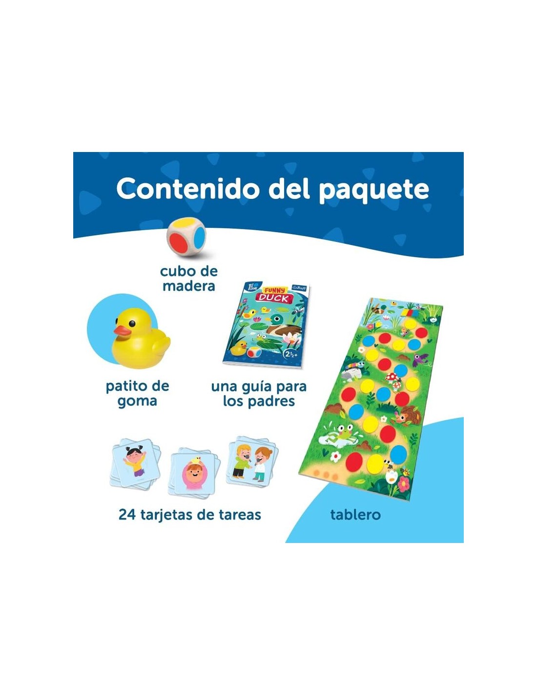 Un tablero de juego, 24 tarjetas de tareas, un pato de goma que sirve de peón, un gran dado de madera y una guía para los padres.