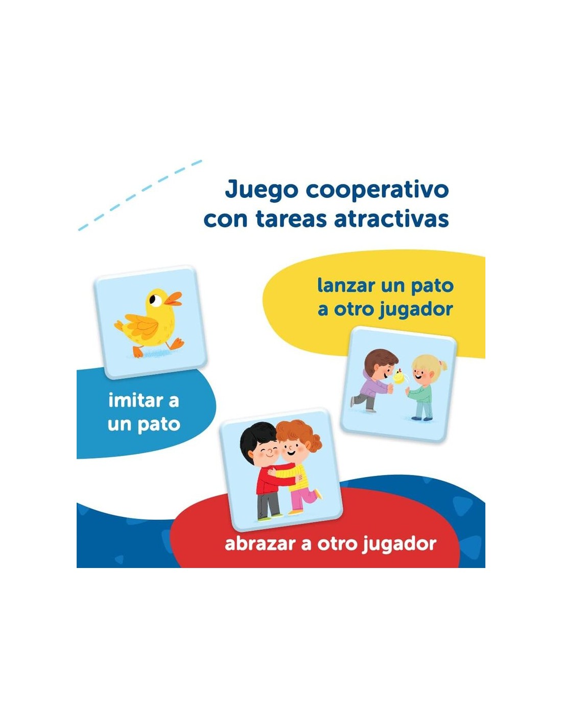 En el juego cooperativo, se realizan 3 tipos de tareas para alcanzar un objetivo común: para realizar solo, con un pato de goma y con otro jugador