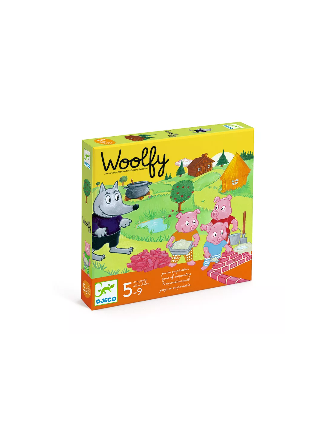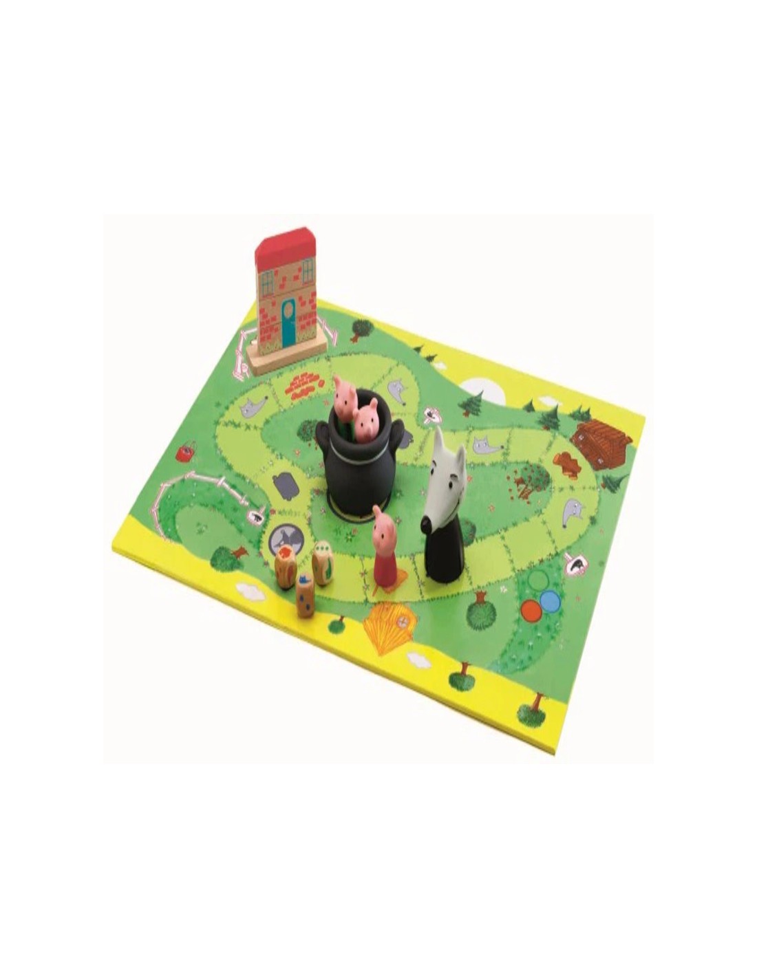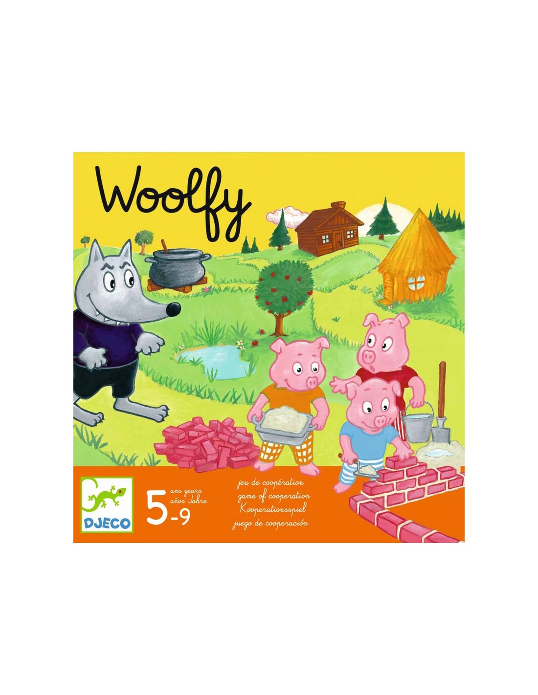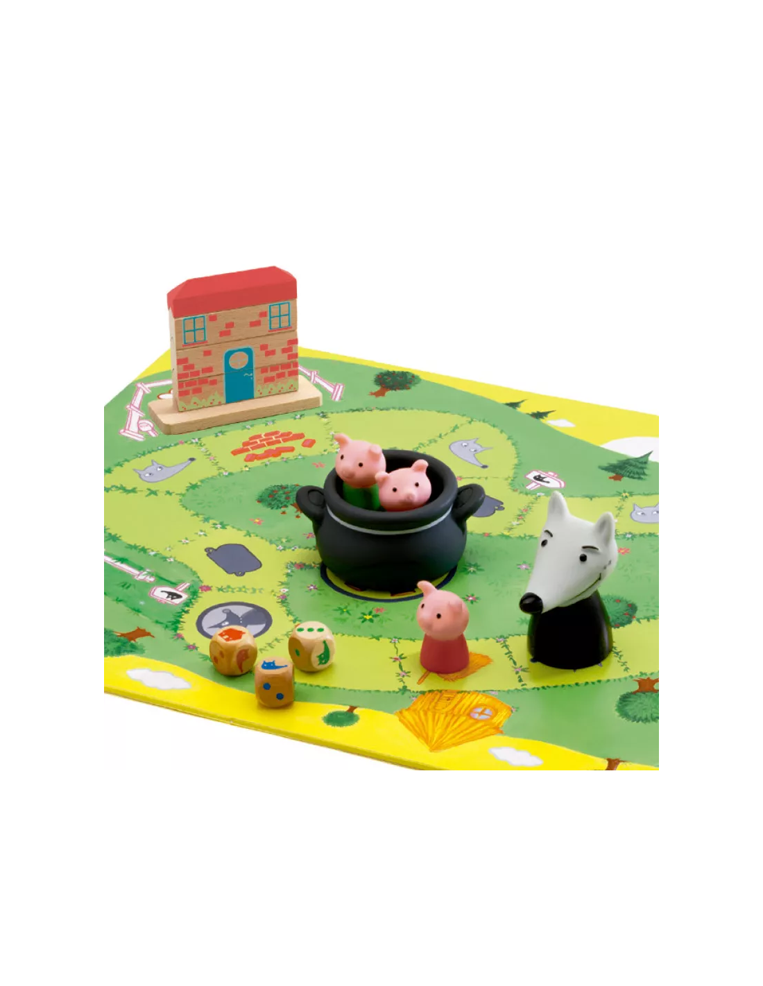 -Un juego de cooperación en el que hay que ayudar a los tres cerditos a construir su casa de ladrillos antes de que el malvado lobo los atrape y los meta en la marmita. Si los tres cerditos logran llegar a su casa construida sanos y salvos, ¡todos los jugadores ganan! Por el contrario, si el lobo consigue atraparlos a todos, ¡es él quien gana la partida!