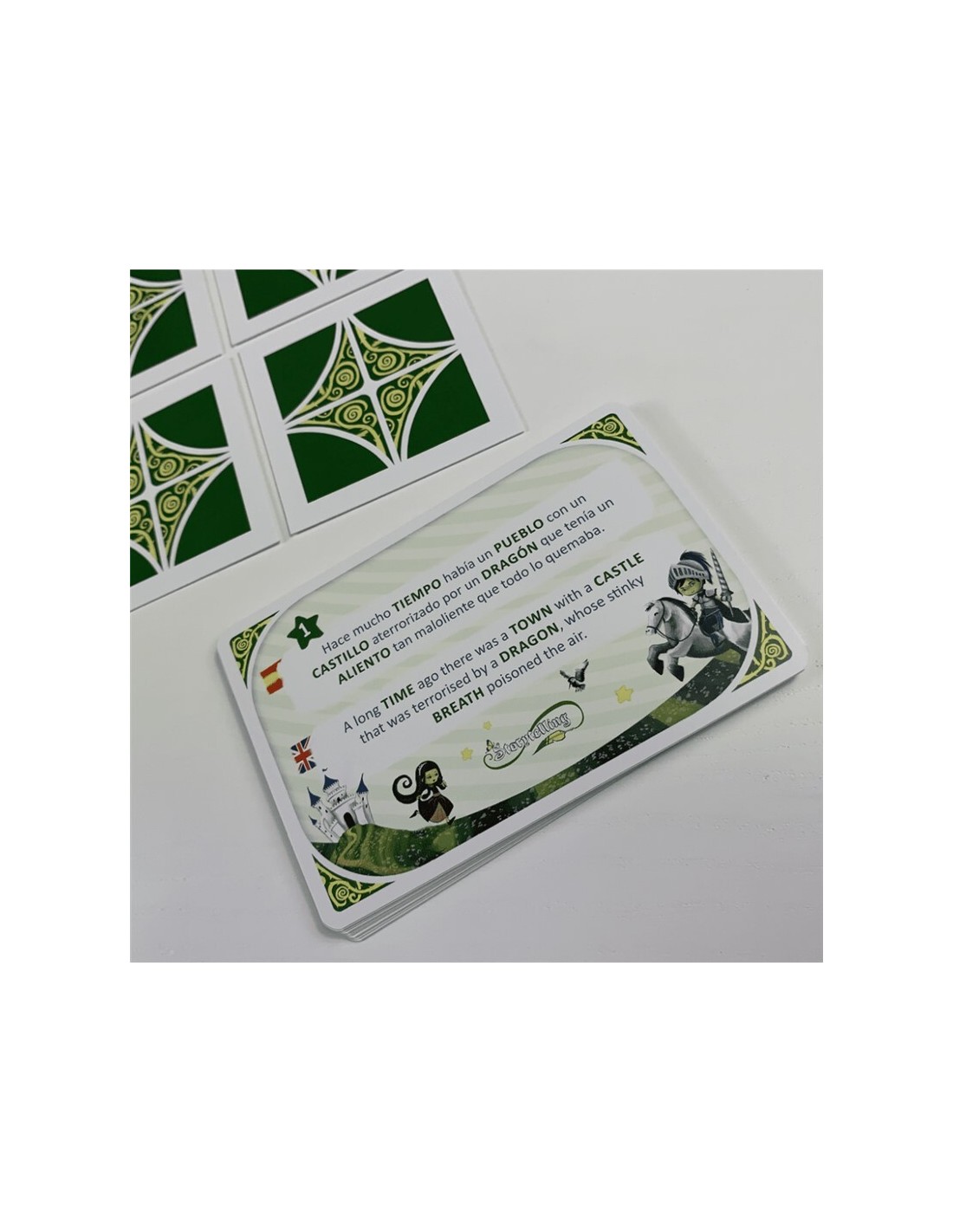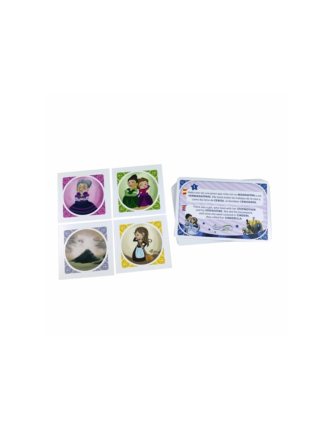 CONTENIDO: 64 fichas de ilustraciones (16 correspondientes a cada cuento), 52 cartas de cuento (13 de cada cuento) en castellano e inglés, 1 ficha de liebre, 1 ficha de tortuga, 1 ficha de reloj e instrucciones en los 2 idiomas.