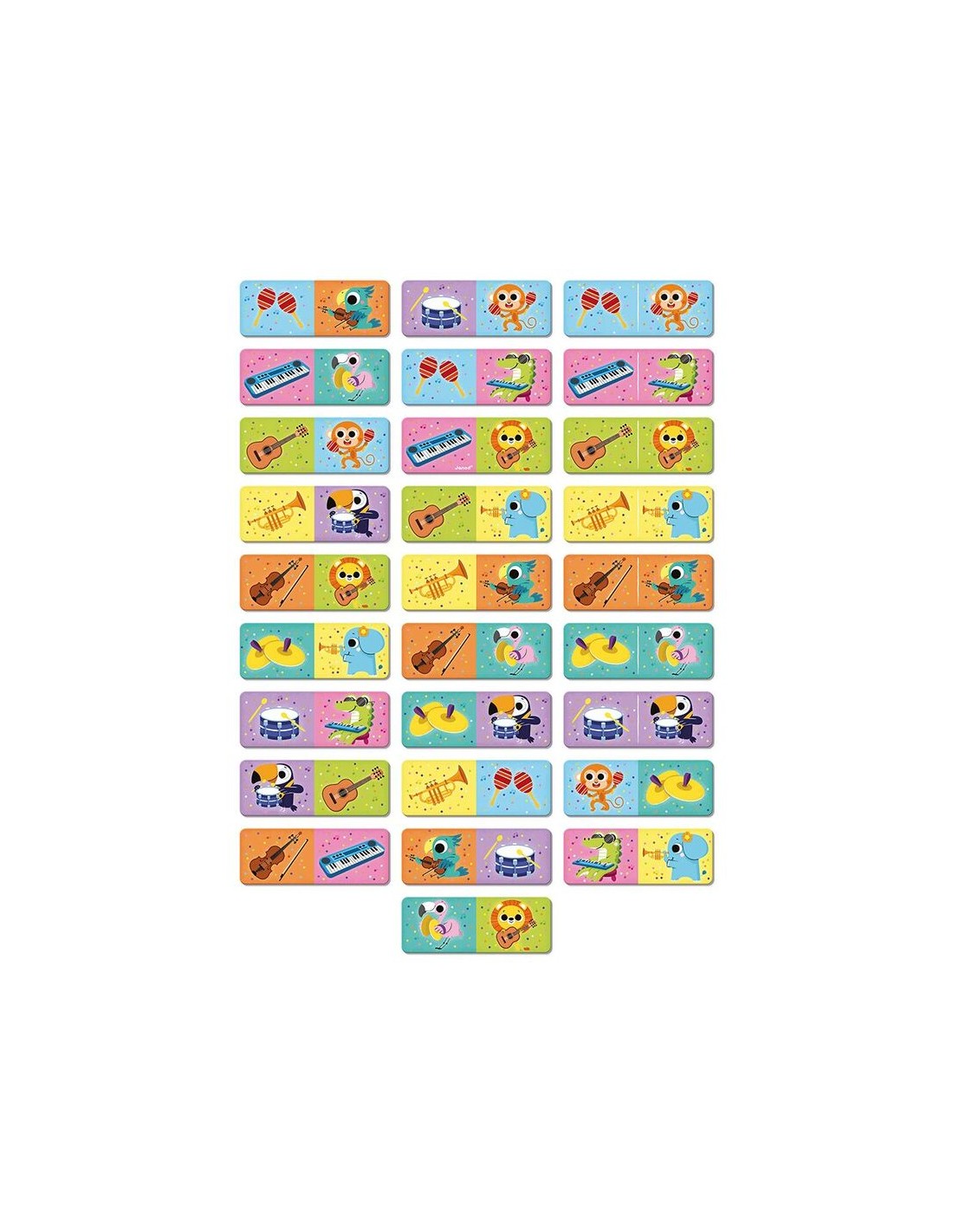 Dominó Instrumentos musicales es un precioso dominó de cartón de Janod. Especialmente recomendado para niños a partir de 3 años, en este dominó es reversible: una cara ilustrada en donde en cada ficha aparece un instrumento musical y un animal en plena interpretación. La otra cara está numerada como si de un dominó tradicional se tratara.