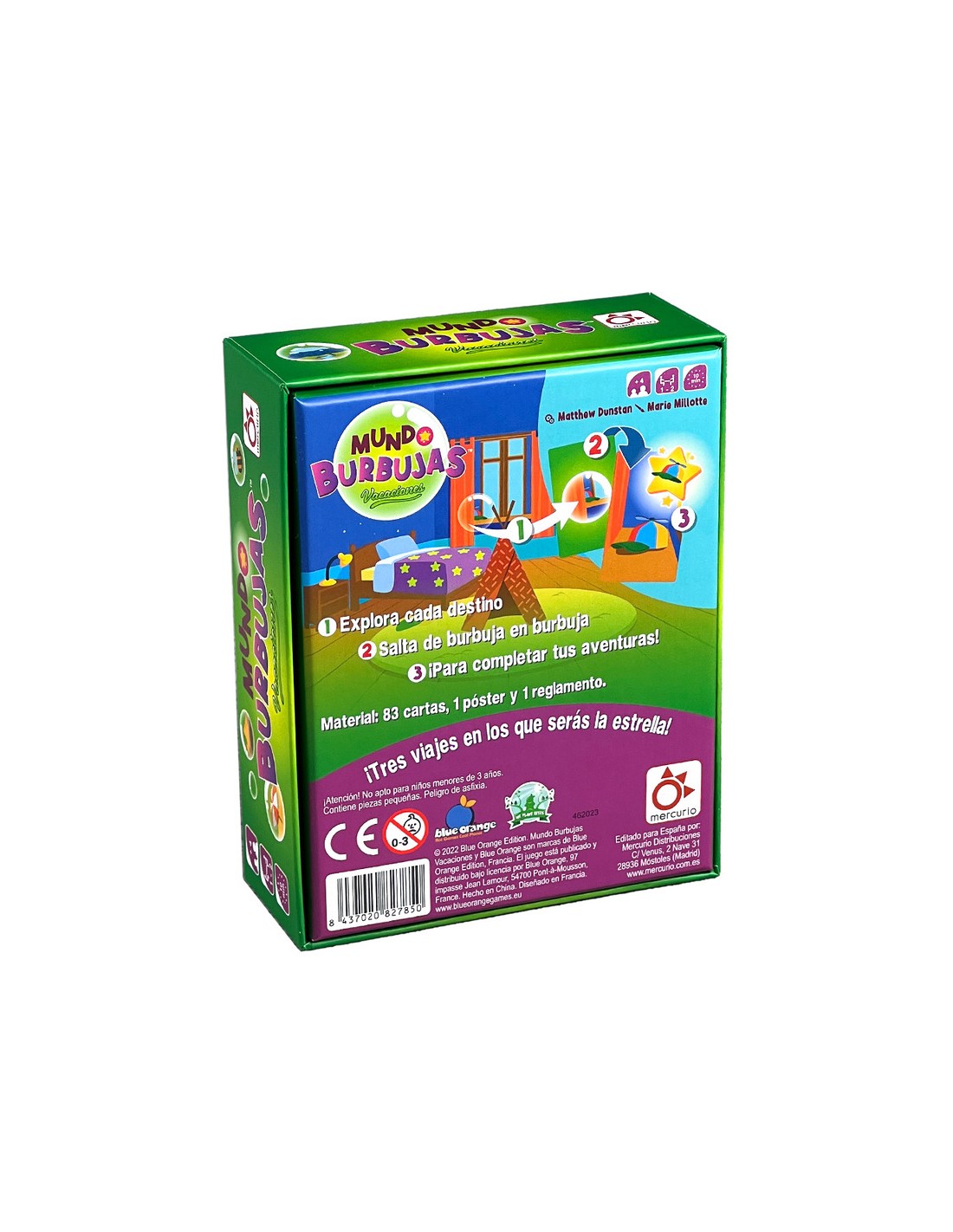 Mundo Burbujas Cuentos es un sencillo juego de cartas de exploración y aventuras que hará las delicias de los pequeños investigadores. En cada partida, los jugadores eligen su aventura y exploran diversos escenarios mágicos. Saltando de burbuja en burbuja, deben recolectar objetos clave que los ayudarán a avanzar y resolver los desafíos de cada historia. Con tres aventuras distintas en cada juego, Mundo Burbujas es un excelente recurso para desarrollar habilidades de observación, planificación y resolución de problemas en los niños, todo mientras se divierten en un entorno colorido y seguro.