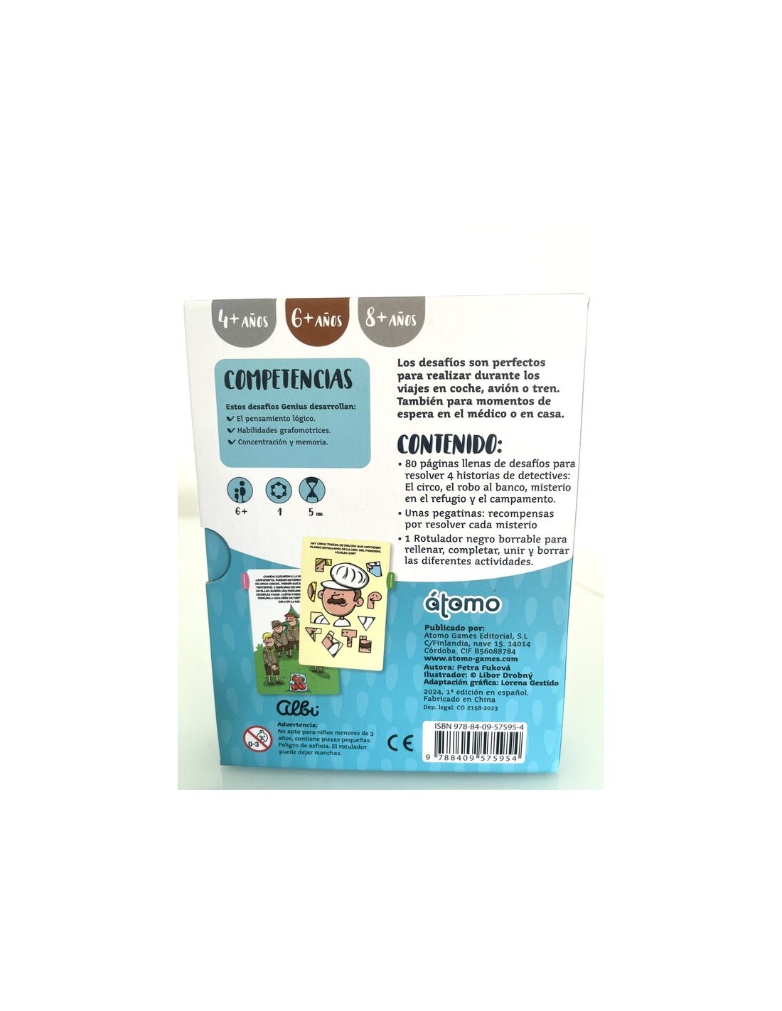 80 páginas llenas de desafíos para resolver 4 historias de detectives: el circo, el robo al banco, misterio en el refugio y el campamento. Además de, añadir 1 rotulador negro borrable como la versión +4 años, trae unas pegatinas como recompensa por resolver cada misterio.