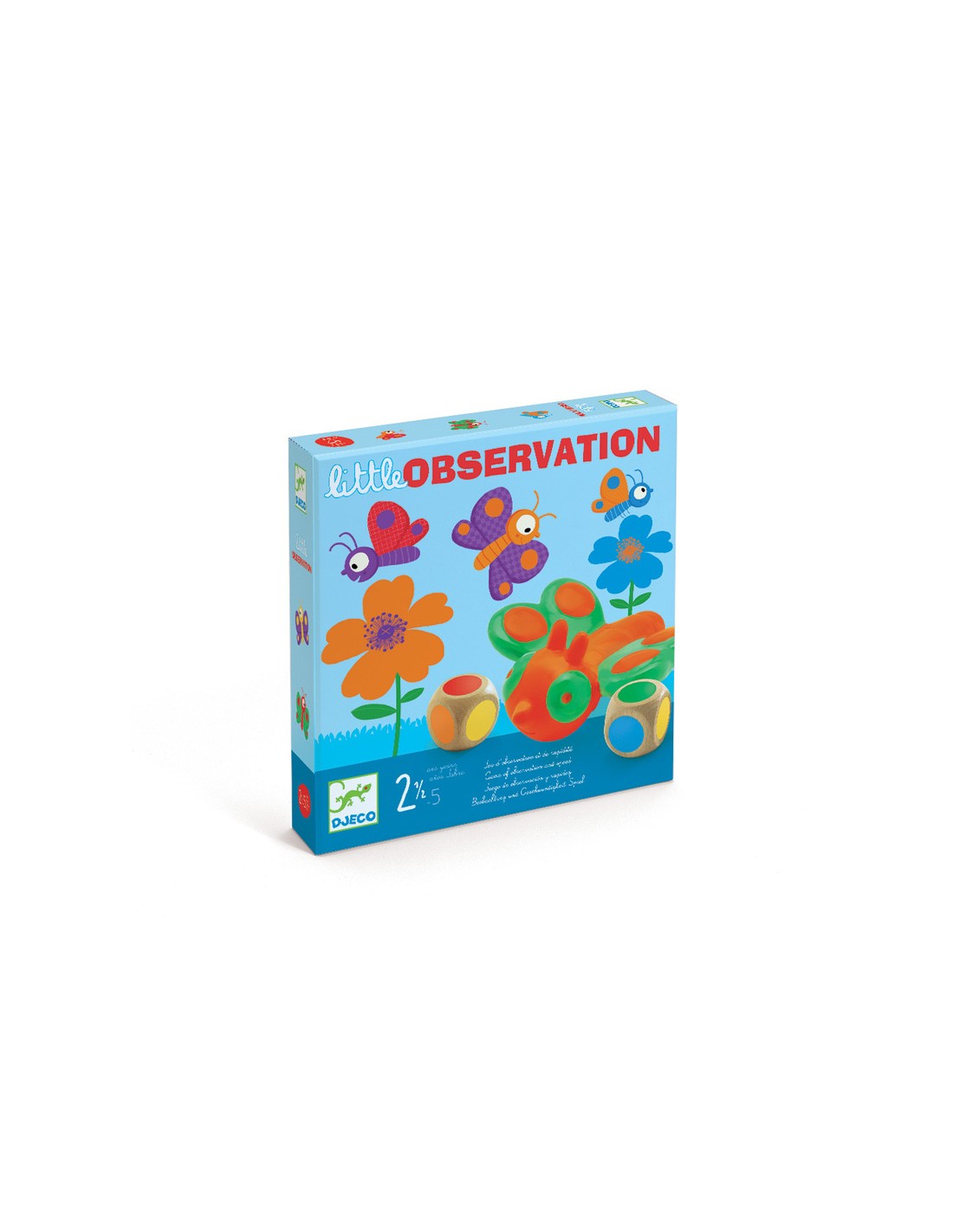 -Un juego de observación especialmente concebido para niños a partir de 2 años y medio. En la caza de mariposas, ¿quién cazará más mariposas? Los dos dados indican una combinación de 2 colores que se encuentran en una de las mariposas. El primero que en verla y cazarla gana una ficha.