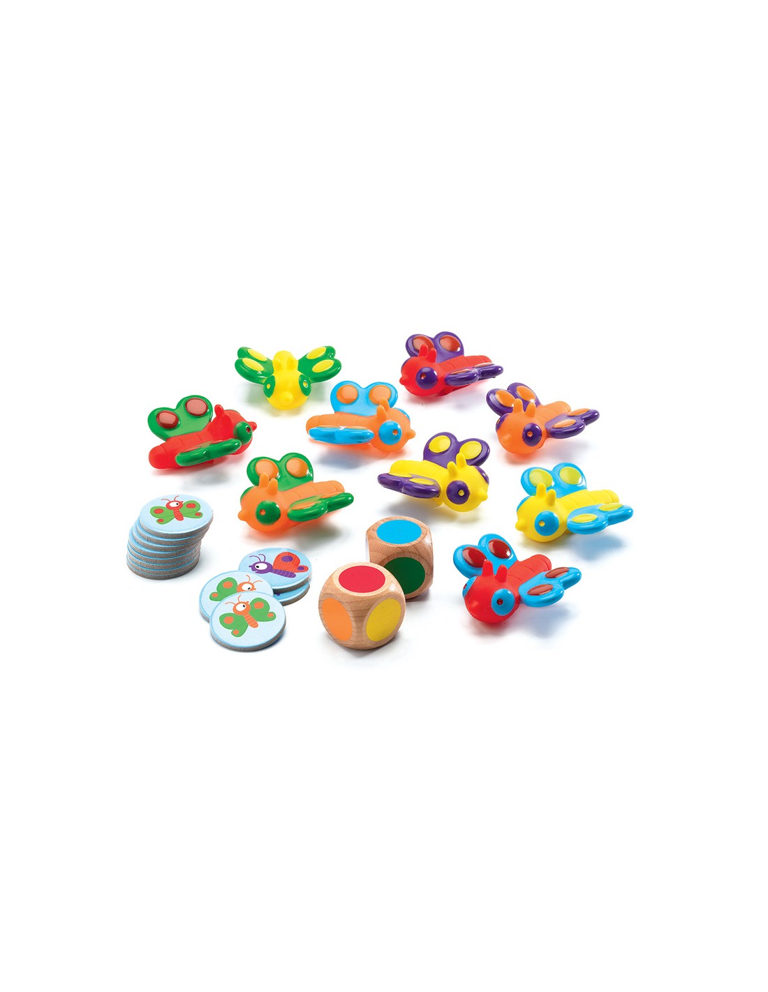 9 mariposas bicolores de plástico blando, 2 dados de madera de colores, 30 fichas. Reglas del juego en 10 idiomas.