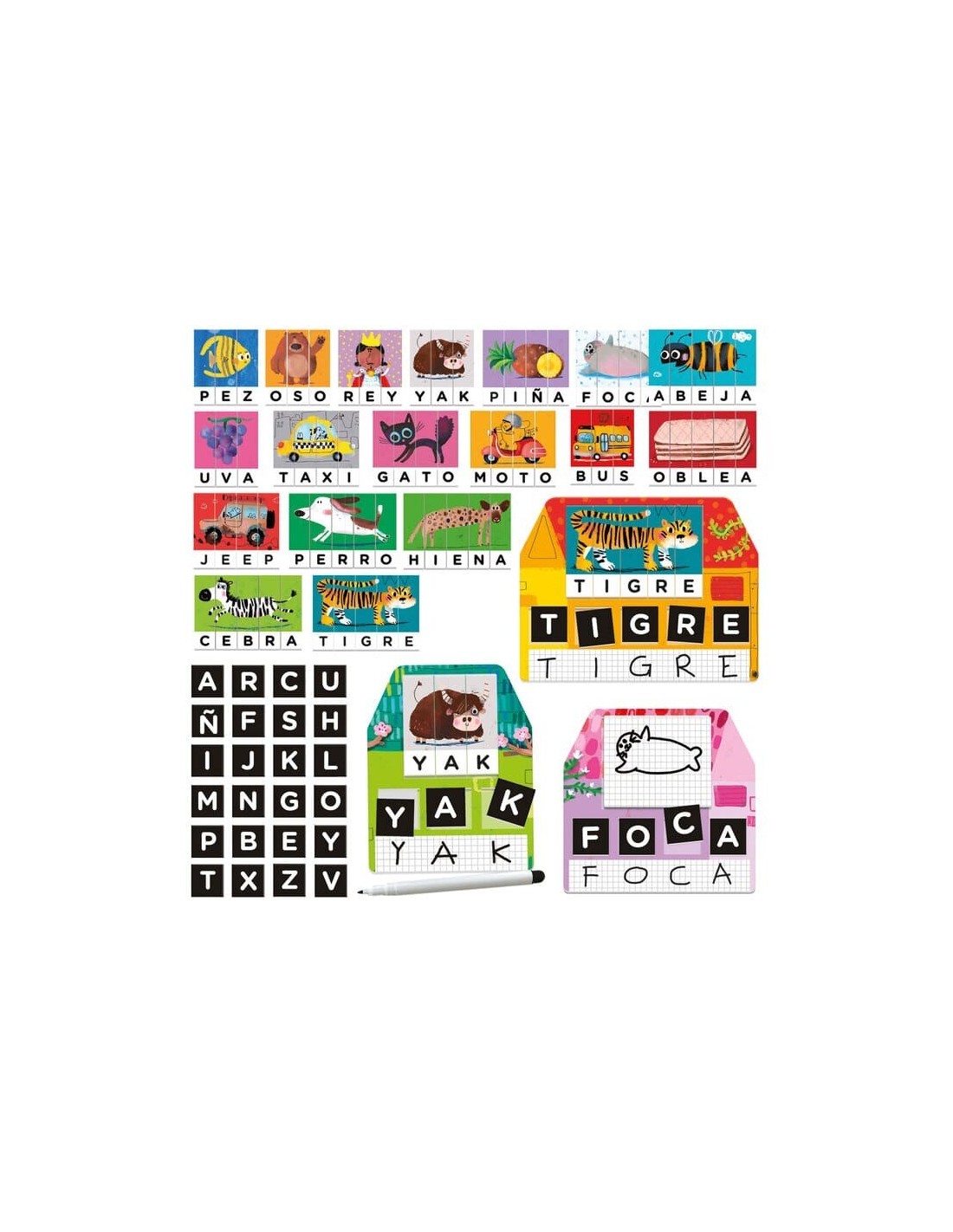 72 letras, tres casas, 18 puzzles, 3 mini pizarras blancas, 1 rotulador borrable, instrucciones.