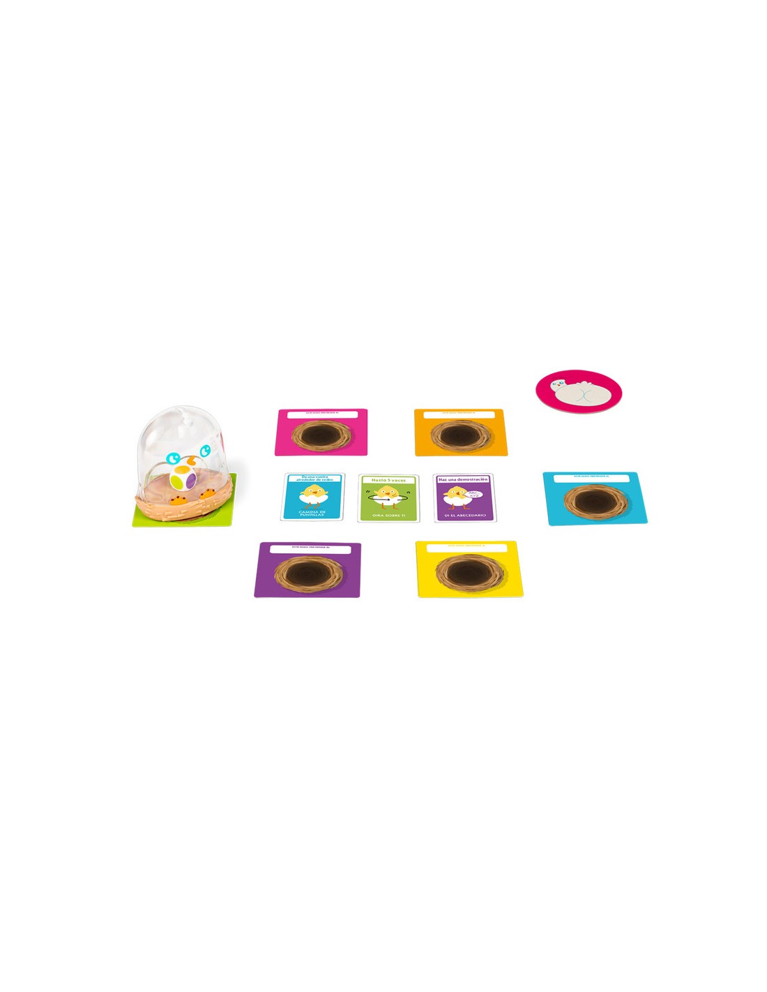 1 Sacudidor del pollito, 6 tapetes de juego, 45 cartas de Actividades y Desafío del culito del pollito