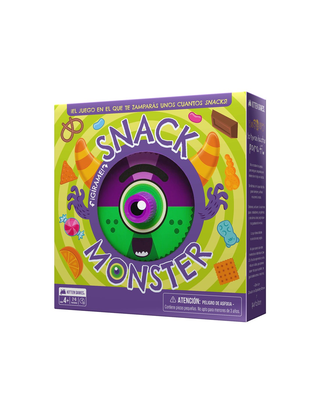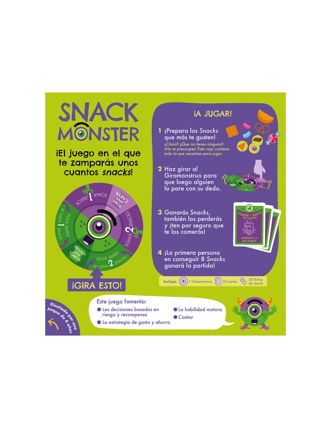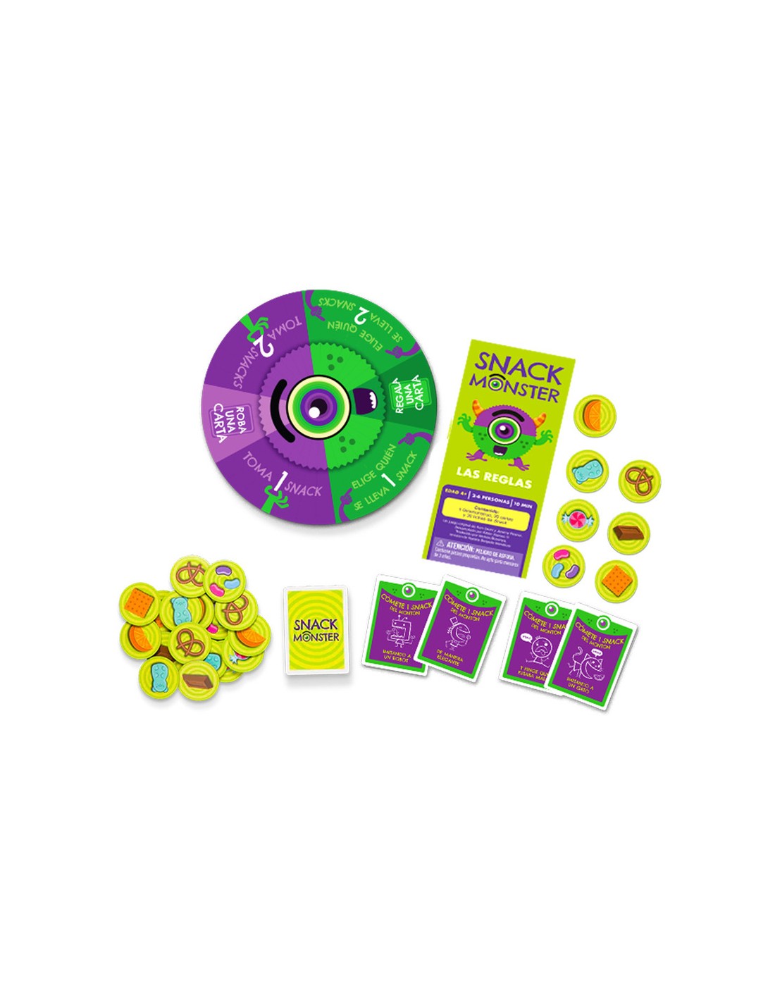 Snack Monster es un sencillo juego en el que toda la familia desde los 4 años se divertirá haciendo girar el Giramonstruo que alguien lo parará con el dedo y se realizará la acción que marca. Con estas acciones, Iremos ganando y perdiendo snack y la primera persona que consiga 8 snack gana la partida.