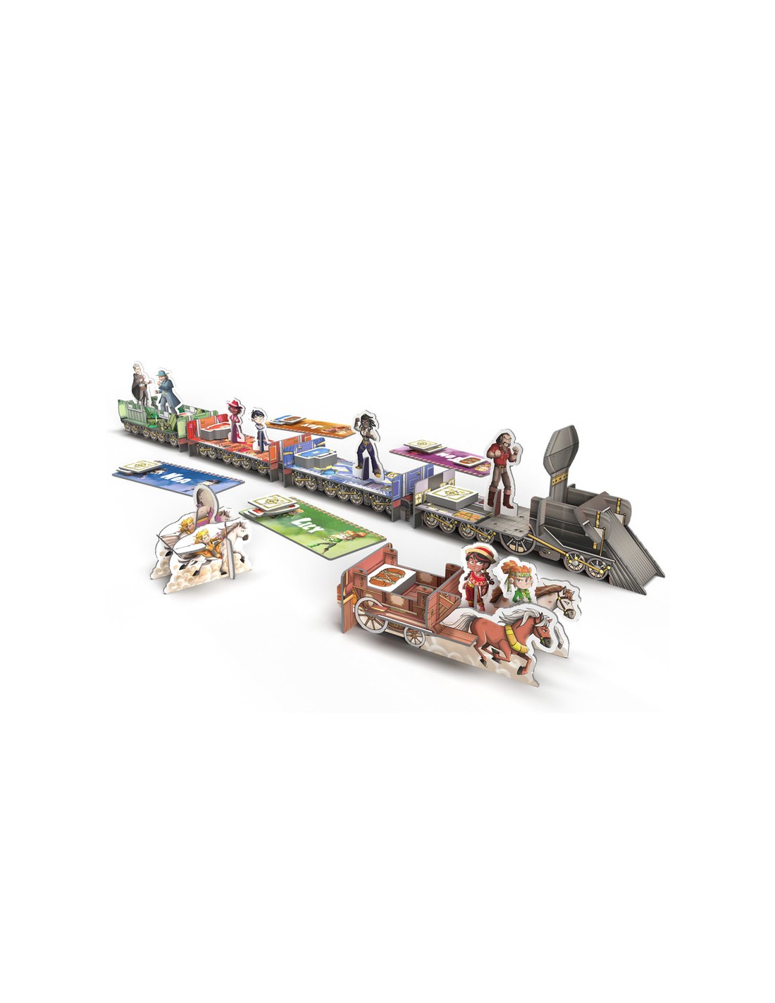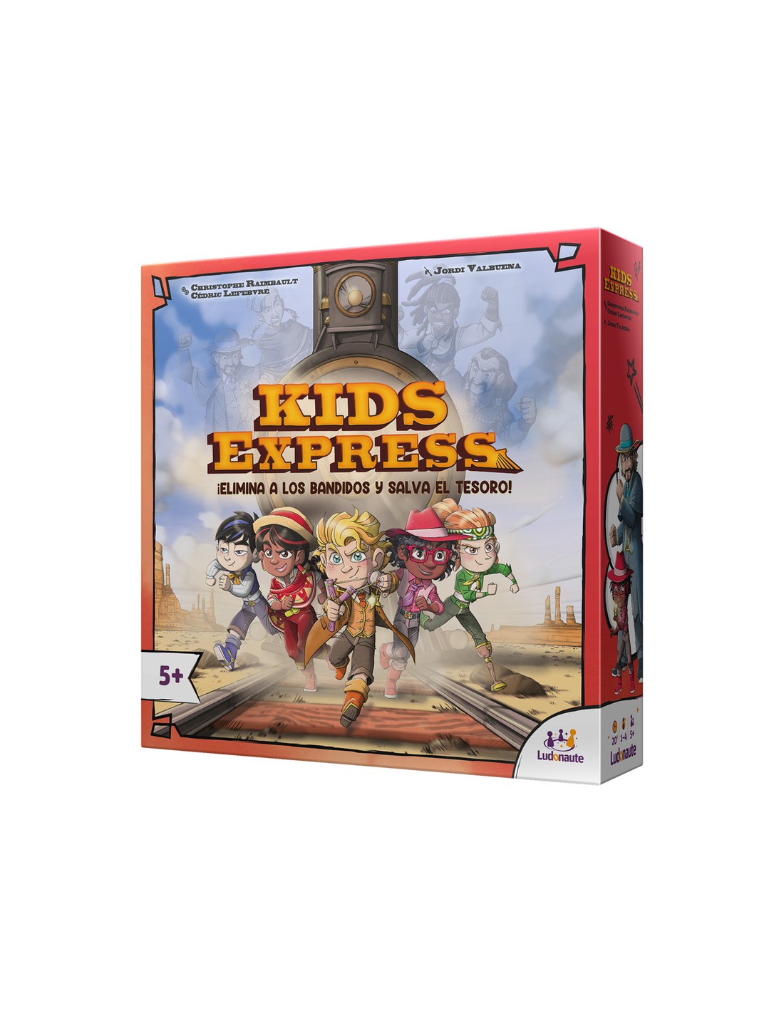 Kids Express es un juego de mesa infantil diseñado por Cédric Lefebvre y Christophe Raimbault, creadores del exitoso Colt Express. Esta versión adaptada para niños mantiene la emoción del oeste con mecánicas accesibles, componentes 3D y una experiencia cooperativa llena de acción.