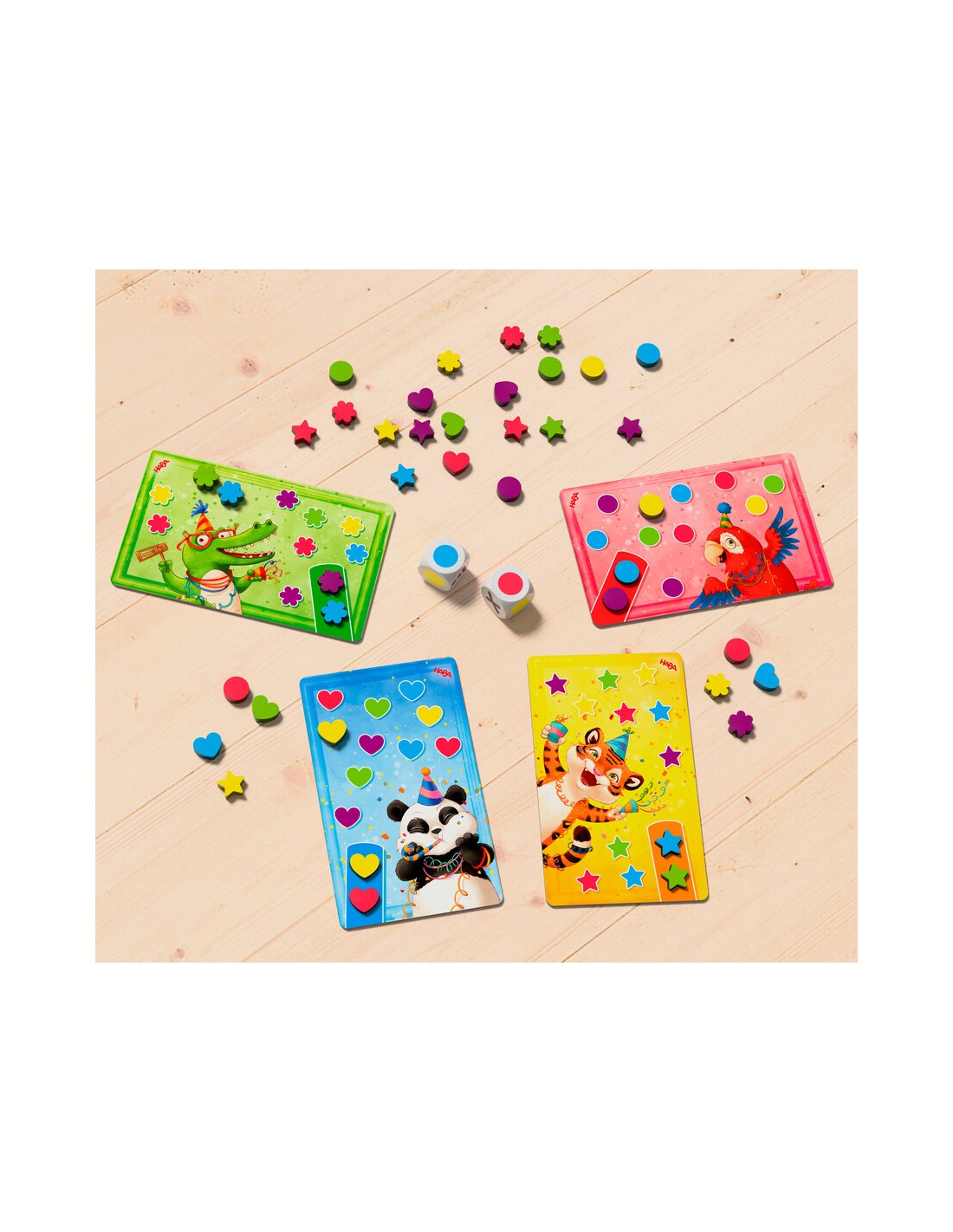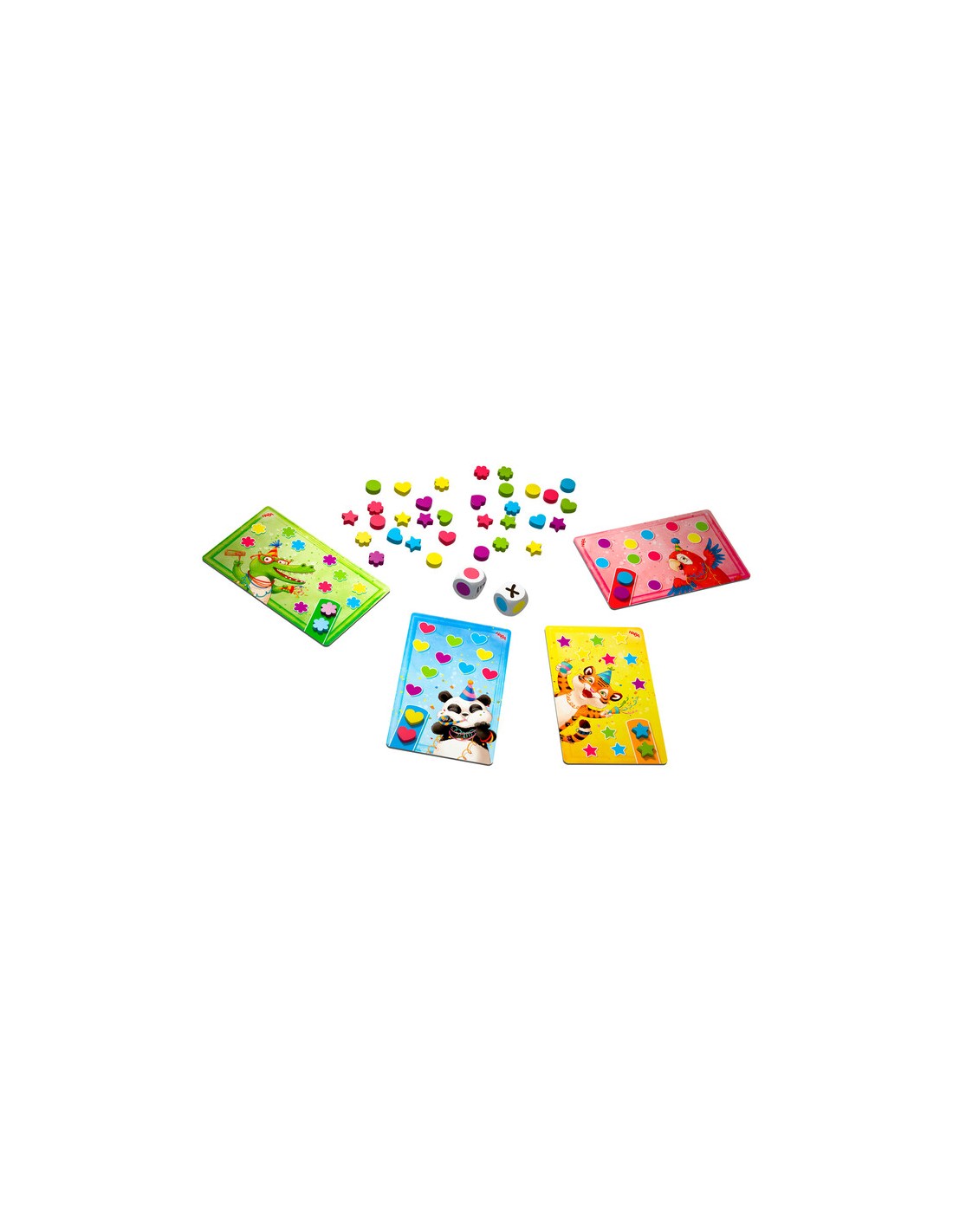 Contenido: 2 dados, 40 fichas de confeti (estrellas, discos, corazones y flores), cartas de animales, instrucciones.