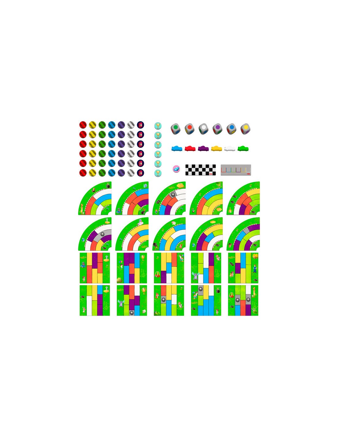 Contenido: 6 coches de madera, 6 dados de colores, 20 piezas de pista (curvas y rectas), casillas de inicio/meta, 48 fichas de cartón (aceleración, tiradas extra, trofeos), instrucciones.