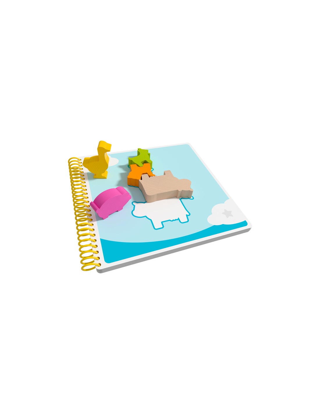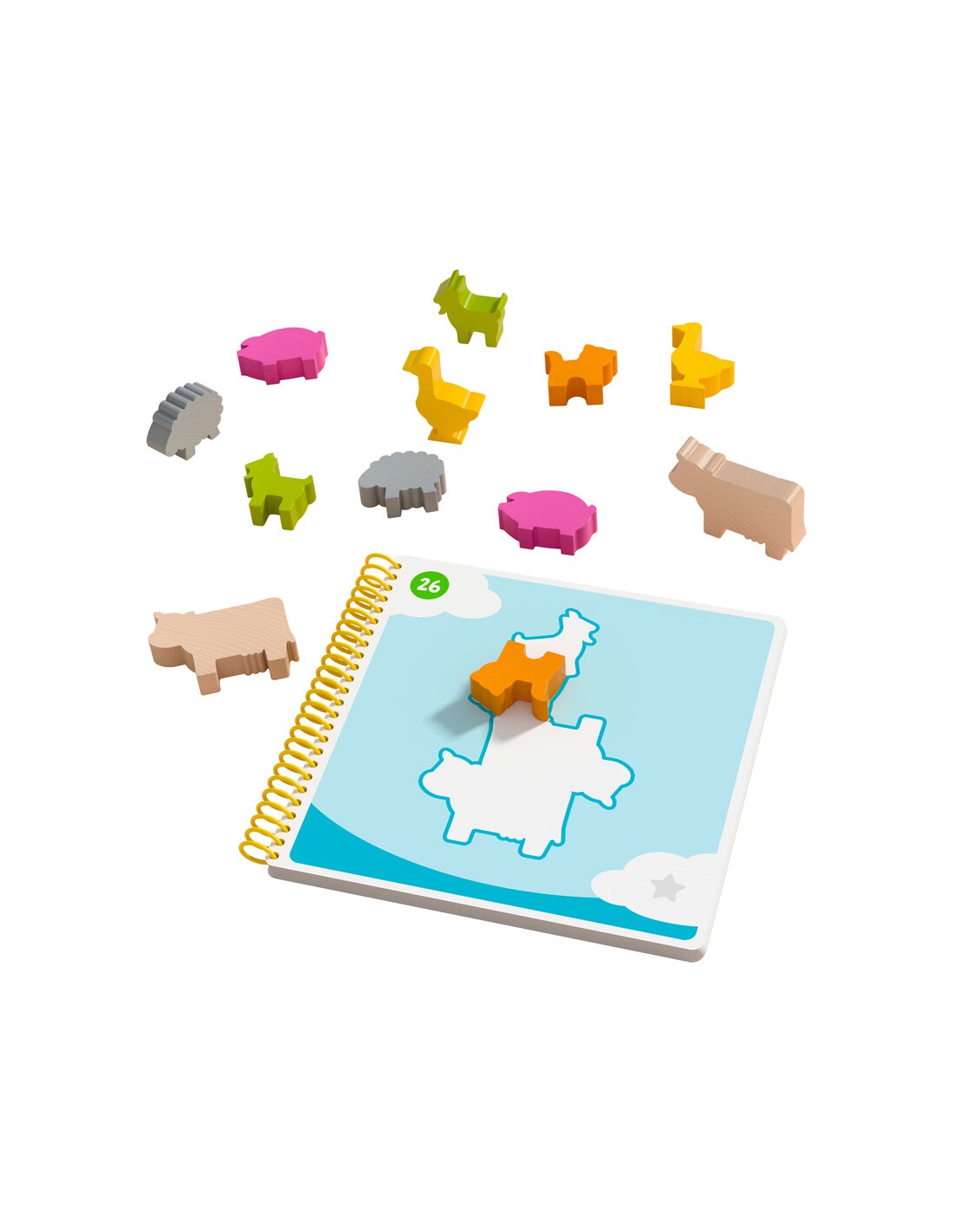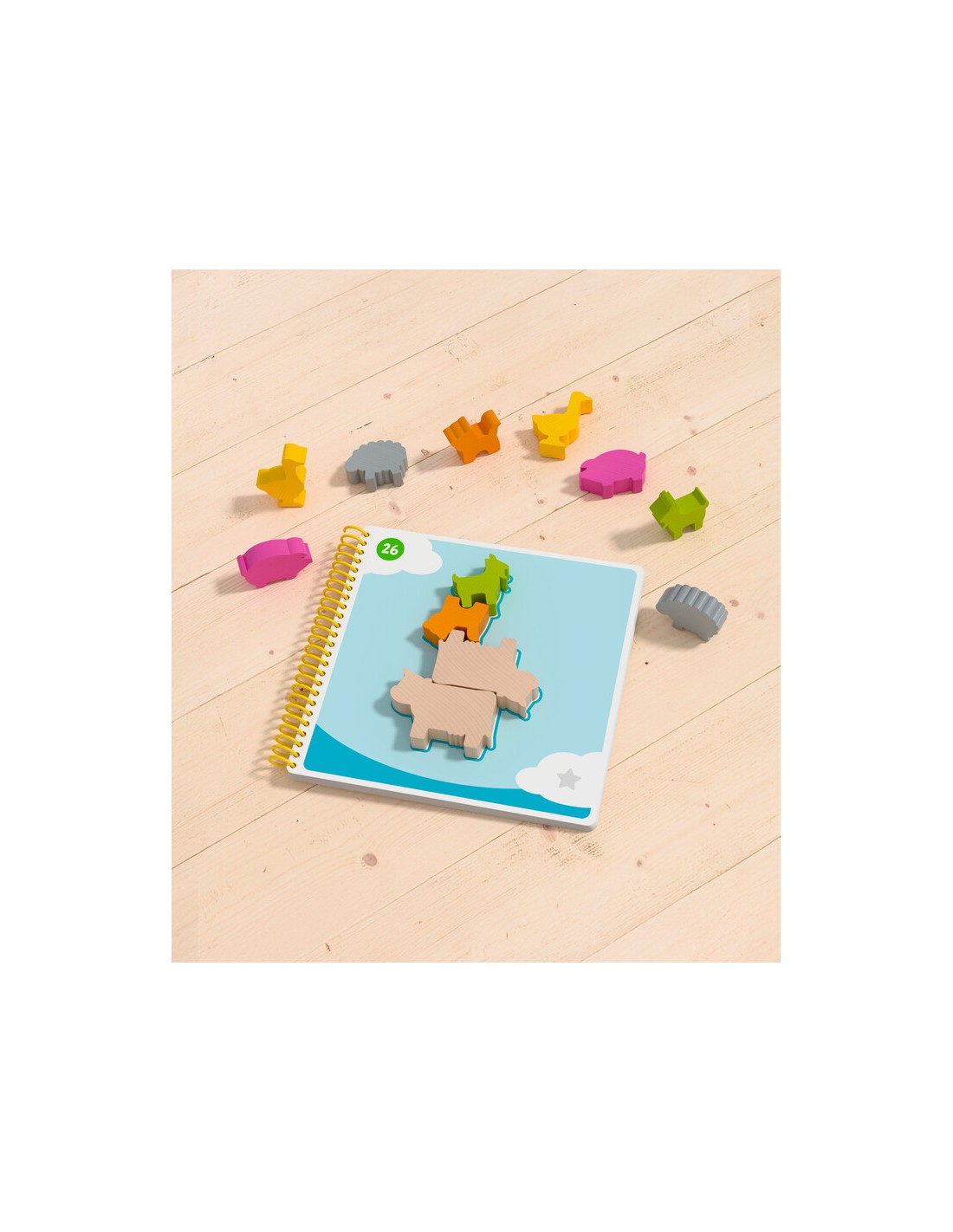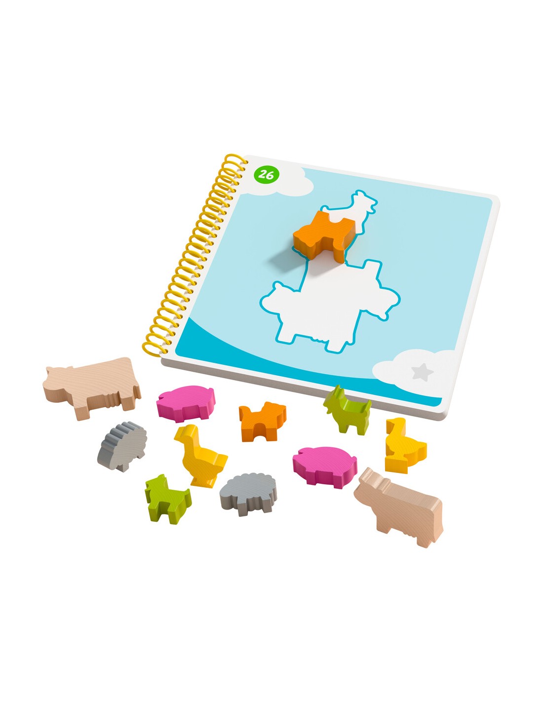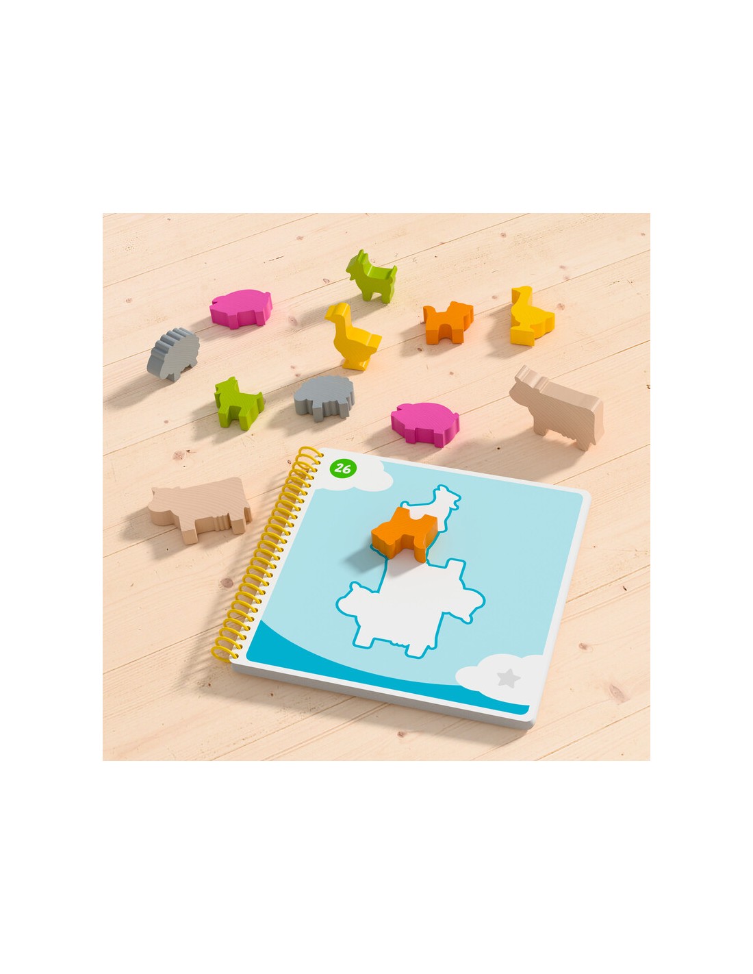 12 animales de madera de colores (2 vacas, 2 cerdos, 2 ovejas, 2 cabras, 2 gansos, 2 gatos), 1 cuaderno de anillas grande con 60 retos de puzzles (incluye hojas con pegatinas), 1 cuaderno de anillas pequeño con las correspondientes soluciones (y lo mismo con los retos de apilado), 1 instrucciones del juego