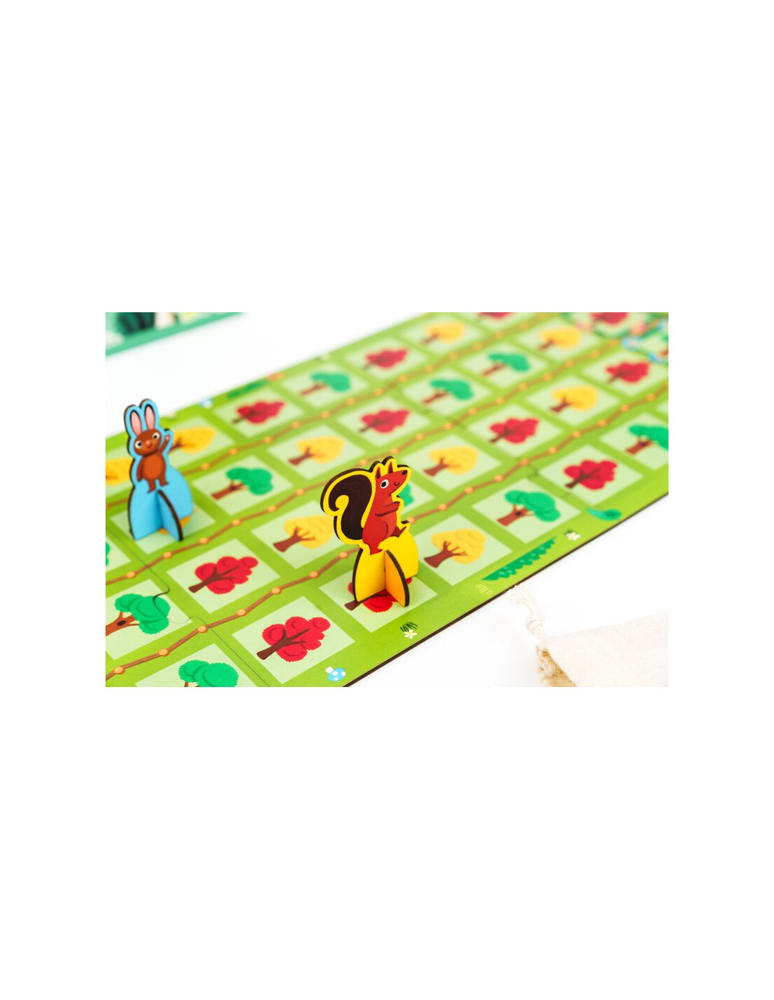 Cada jugador elige un animal del bosque y compite por llegar al borde del tablero.