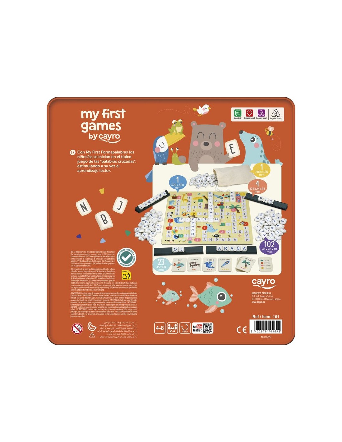 My First - Formapalabras es un juego educativo para iniciarse en el juego de las "palabras cruzadas". Diseñado por la marca española Cayro, específicamente pensado para niños que están iniciando su aventura en el mundo del lenguaje. Forma parte de la línea "My First", enfocada en el desarrollo temprano de habilidades clave a través del juego.