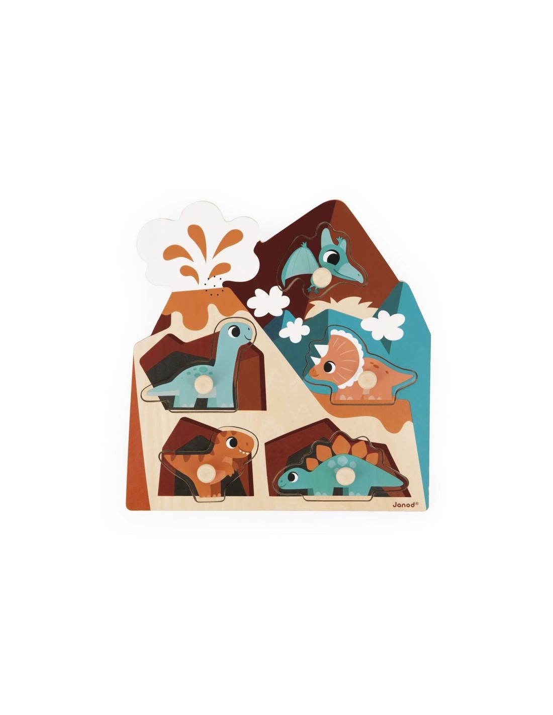 Un rompecabezas… ¡que hace ruido! Este rompecabezas de madera con sonido, con temática de dinosaurios, es ideal para niños a partir de 18 meses. Compuesto por 5 piezas encajables, ha sido diseñado para las manitas más curiosas. Las piezas, con bordes redondeados y clavijas de madera, son fáciles de agarrar y manipular. ¡Este juguete de desarrollo es perfecto para estimular la motricidad fina, la lógica y la agudeza auditiva desde muy pequeños! Cada pieza representa un dinosaurio: Tiranosaurio, Diplodocus, Triceratops, Pteranodon y Estegosaurio. Una vez colocada la pieza correctamente, simplemente presiónala para escuchar el rugido del dinosaurio correspondiente.