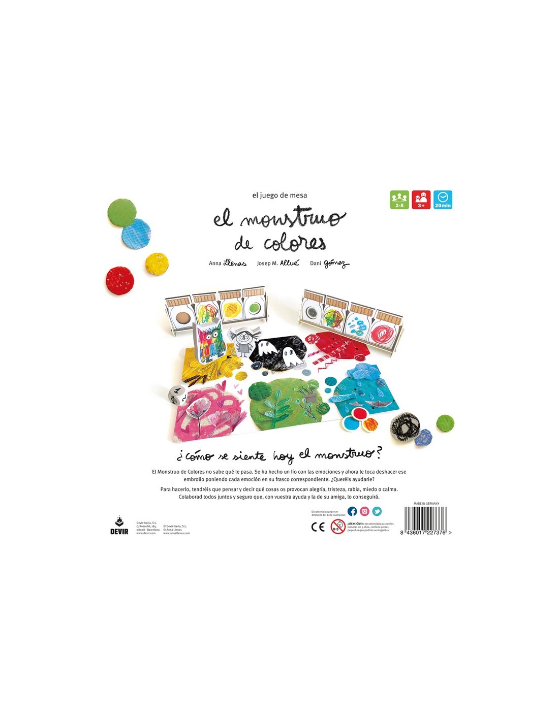 Tal como pasa en el cuento, el monstruo se ha hecho un lío con las emociones y su cuerpo está lleno de colores. En El Monstruo de Colores los jugadores tendrán que colaborar para ayudar al Monstruo a reconocer sus emociones y entender qué le pasa. Por turnos, deberán tirar el dado que les permitirá mover al monstruo alrededor del tablero y recoger las fichas de las emociones básicas (alegría, tristeza, miedo, calma y rabia) que se tendrán que poner en los distintos frascos. Para obtener estas fichas, los jugadores deben contar una historia o experiencia relacionada con a emoción. Una vez compartida la experiencia, el jugador deberá elegir uno de los ocho frascos disponibles sin saber a qué corresponde. O bien le tocará una de las cinco emociones o bien descubrirá uno de los 3 líos. Si salen los 3 líos antes que el monstruo haya entendido las emociones… ¡Habrá que volver a empezar!