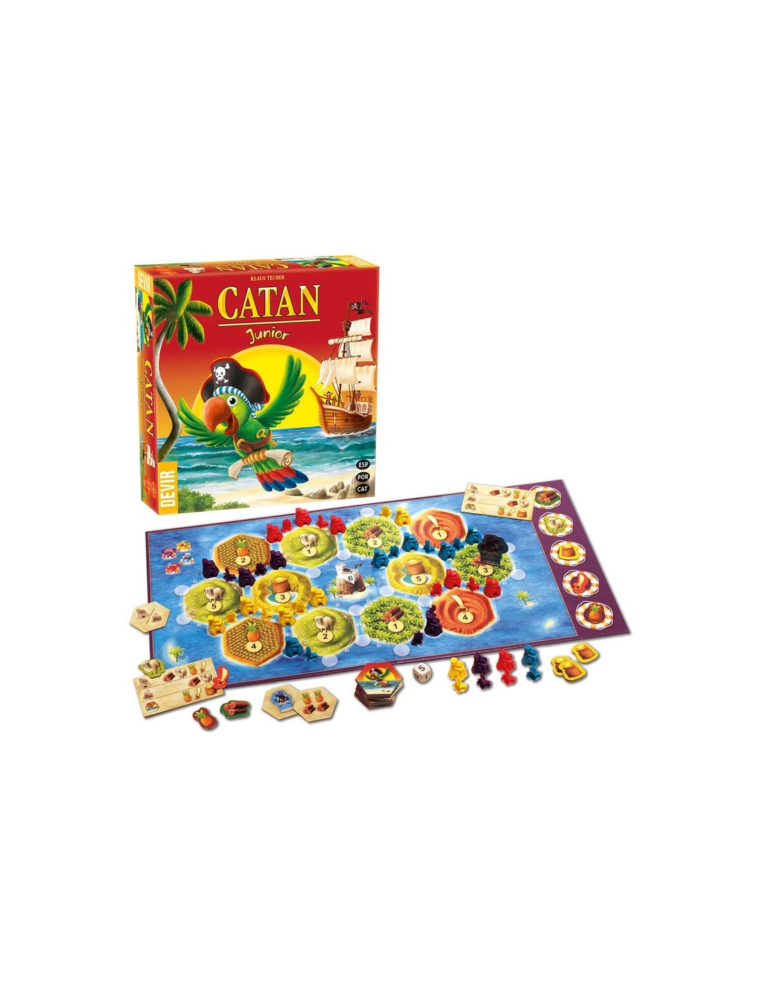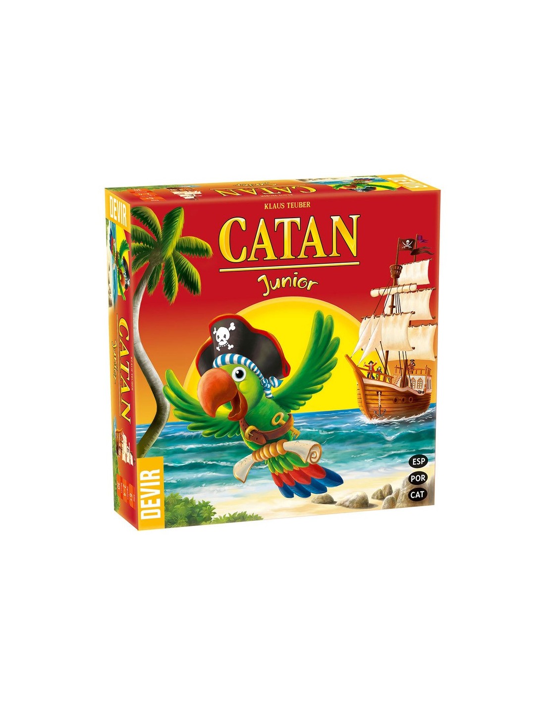 Catan Junior mantiene las mismas mecánicas de comercio que Catan Básico, y está adaptado para poder jugar fácilmente con los peques e iniciar su carrera en el mundo de los juegos de mesa. Con una ambientación de piratas, los jugadores van colocando guaridas en un anillo de islas y construyendo barcos para poder conseguir materiales de otras islas. Cada turno, puedes construir un barco, obtener ayuda de Coco (el loro) para conseguir grandes recompensas, o construir una guarida. El primer jugador que controle 7 guaridas será el ganador. En cada turno, un jugador es el capitán, empezando por el jugador más joven. El capitán tirará el dado y con ello determinará qué fichas de «esto y aquello» se reparten a los jugadores. Después el capitán, en el orden que desee, podrá construir guaridas y barcos así como pedir ayuda a Coco. Si no dispone de las fichas necesarias, podrá cambiar de «esto y aquello». Luego, el jugador situado a su izquierda será el nuevo capitán. ¡Cuidado con La Pirata Rapaz, que puede estropearte los planes!