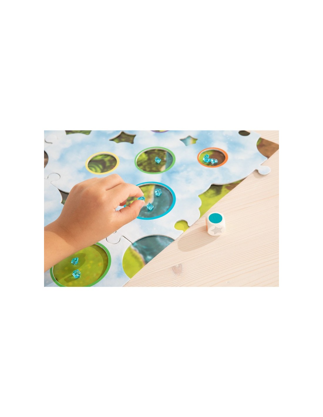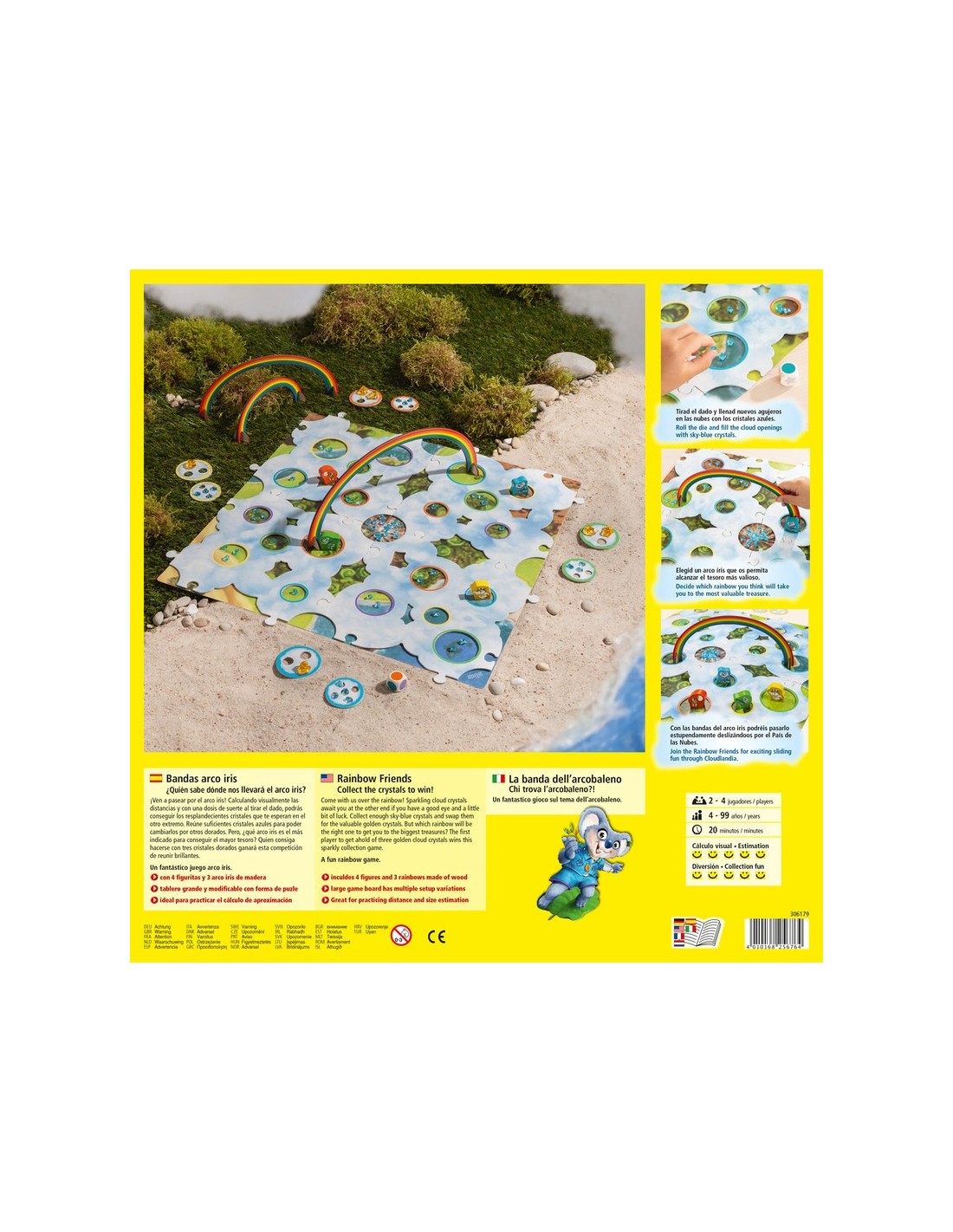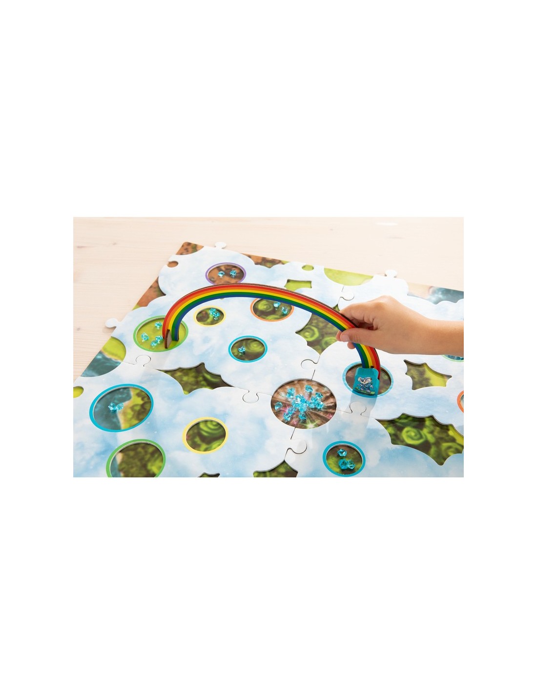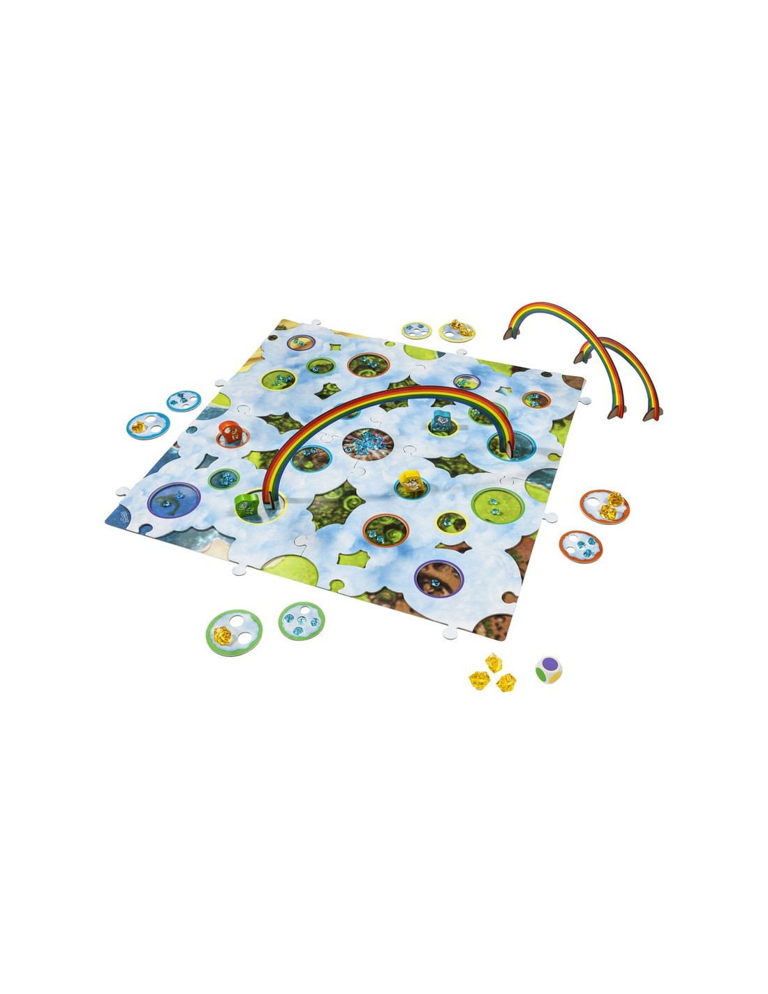 Calculando visualmente las distancias y con una dosis de suerte al tirar el dado, podréis conseguir los resplandecientes cristales que os esperan en el extremo del arco iris. Debéis reunir suficientes cristales azules para cambiarlos por otros dorados. Pero, ¿qué arco iris es el más indicado para conseguir el mayor tesoro? Quien primero consiga hacerse con tres cristales dorados ganará esta competición de reunir colores brillantes.